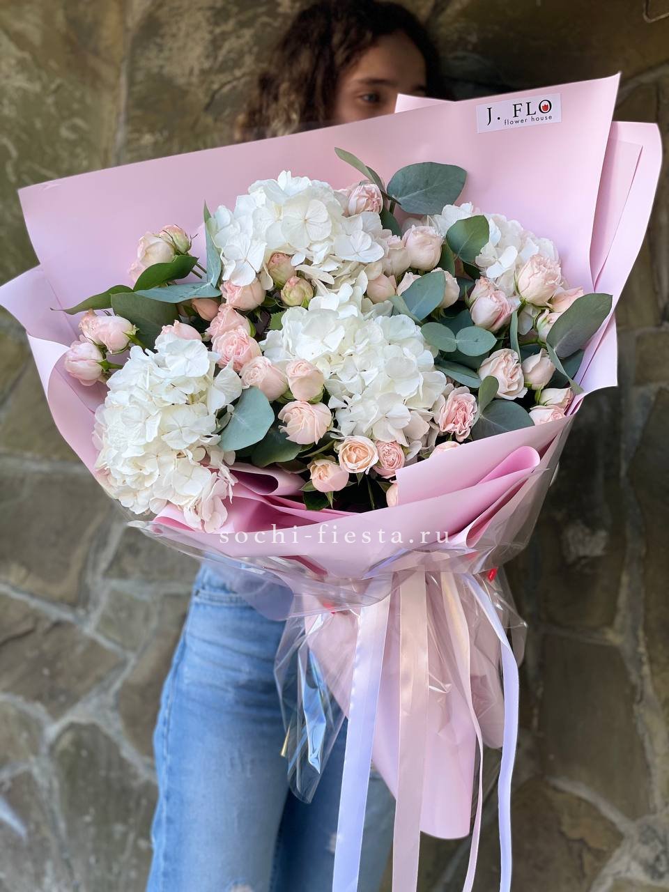 Пять пышных соцветий гортензии собраны в плотный букет с ветками эвкалипта. Розовый оттенок лепестков создаёт мягкое облако цвета, а зелень добавляет свежести композиции. Такой формат хорош для интерьера в светлых тонах.