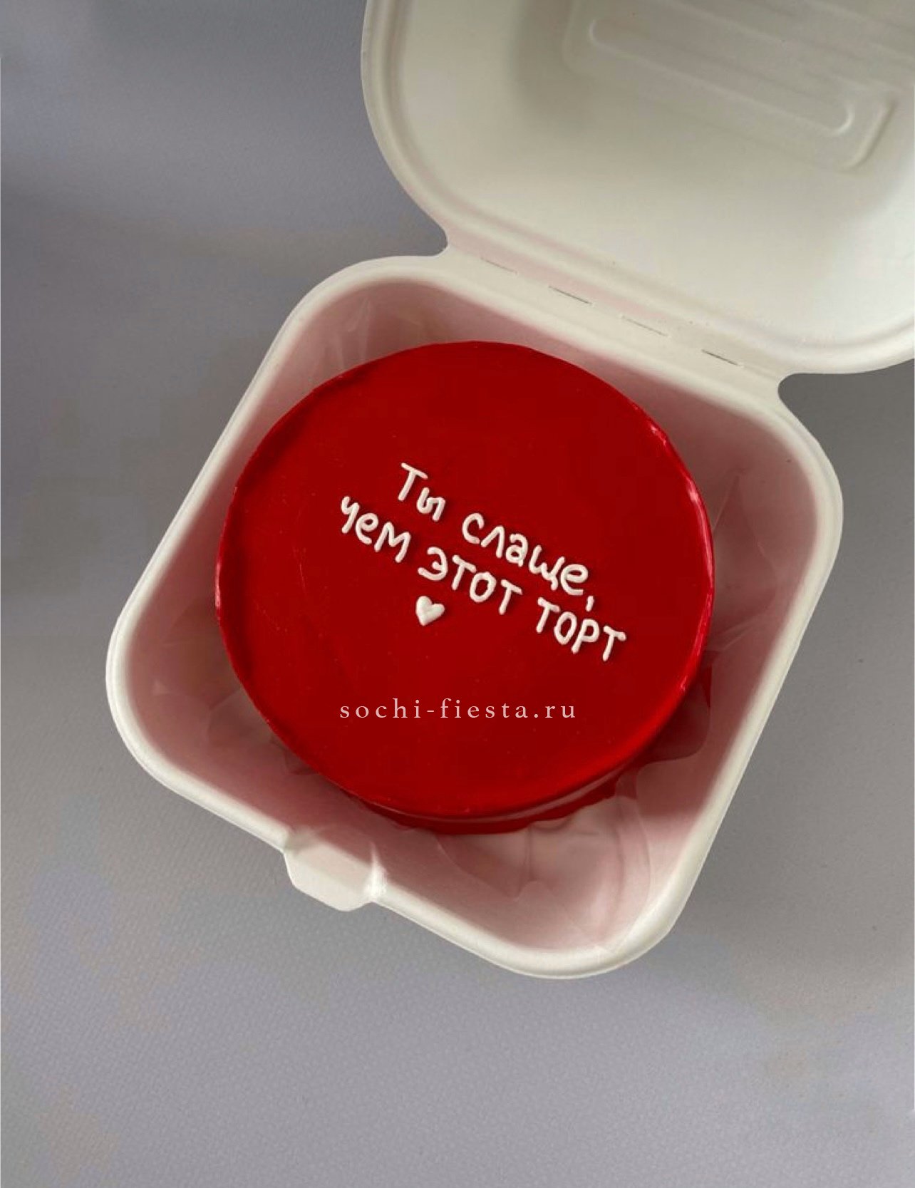 Авторский бенто-торт с теплой надписью для самого близкого человека. Начинка на выбор клубничный пломбир или шоколадный трюфель дополняет продуманное оформление. Упаковка и декор включены.