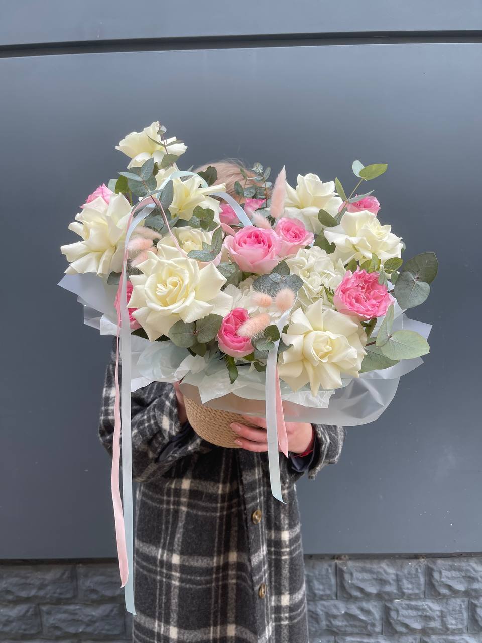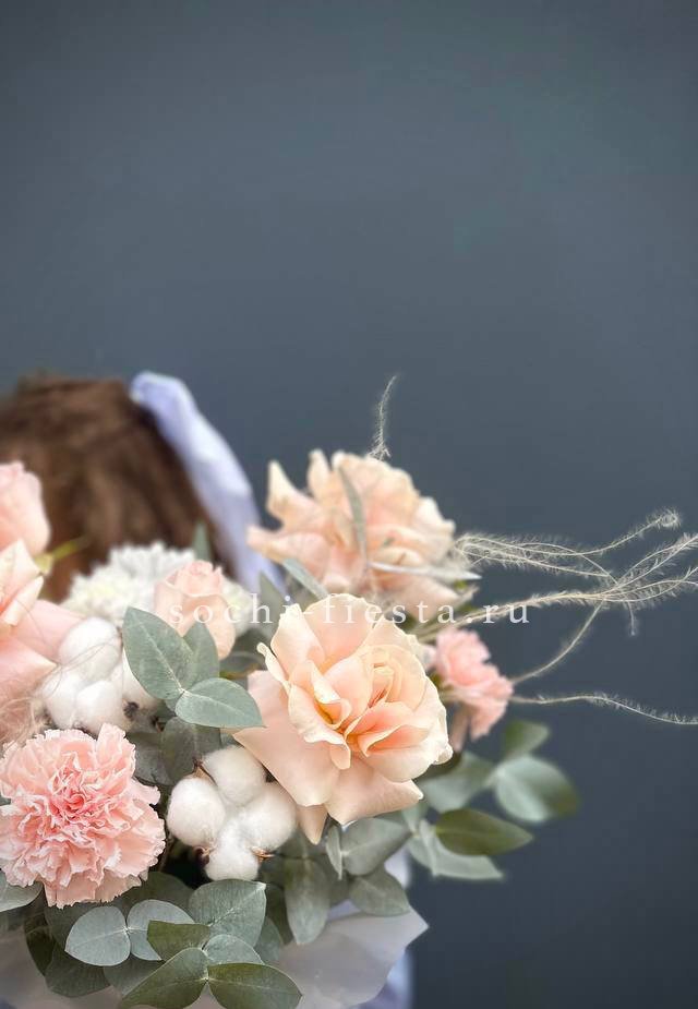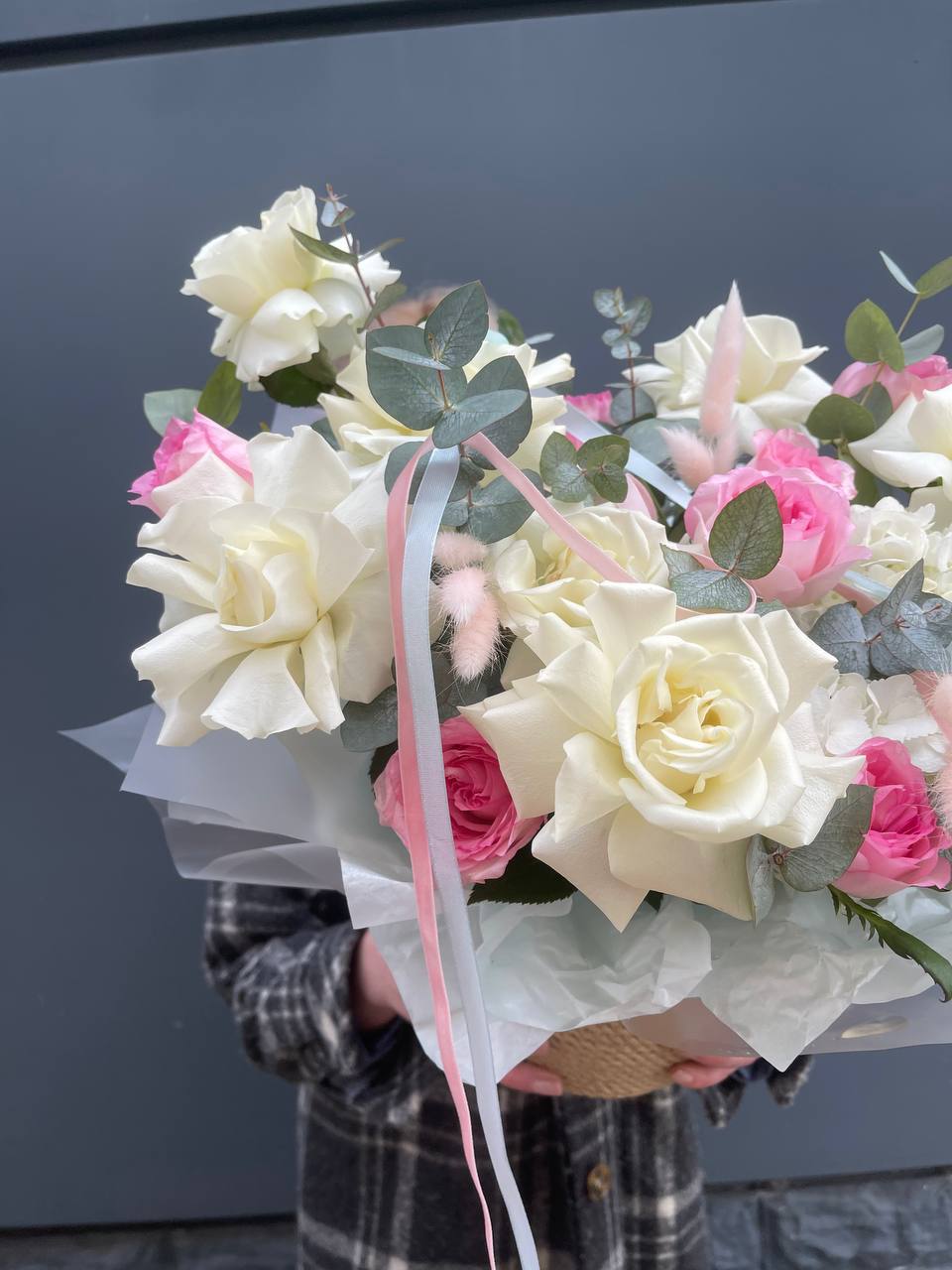 маттиола, розовые розы, гортензии, диантусы, лента и дизайнерская пленка.