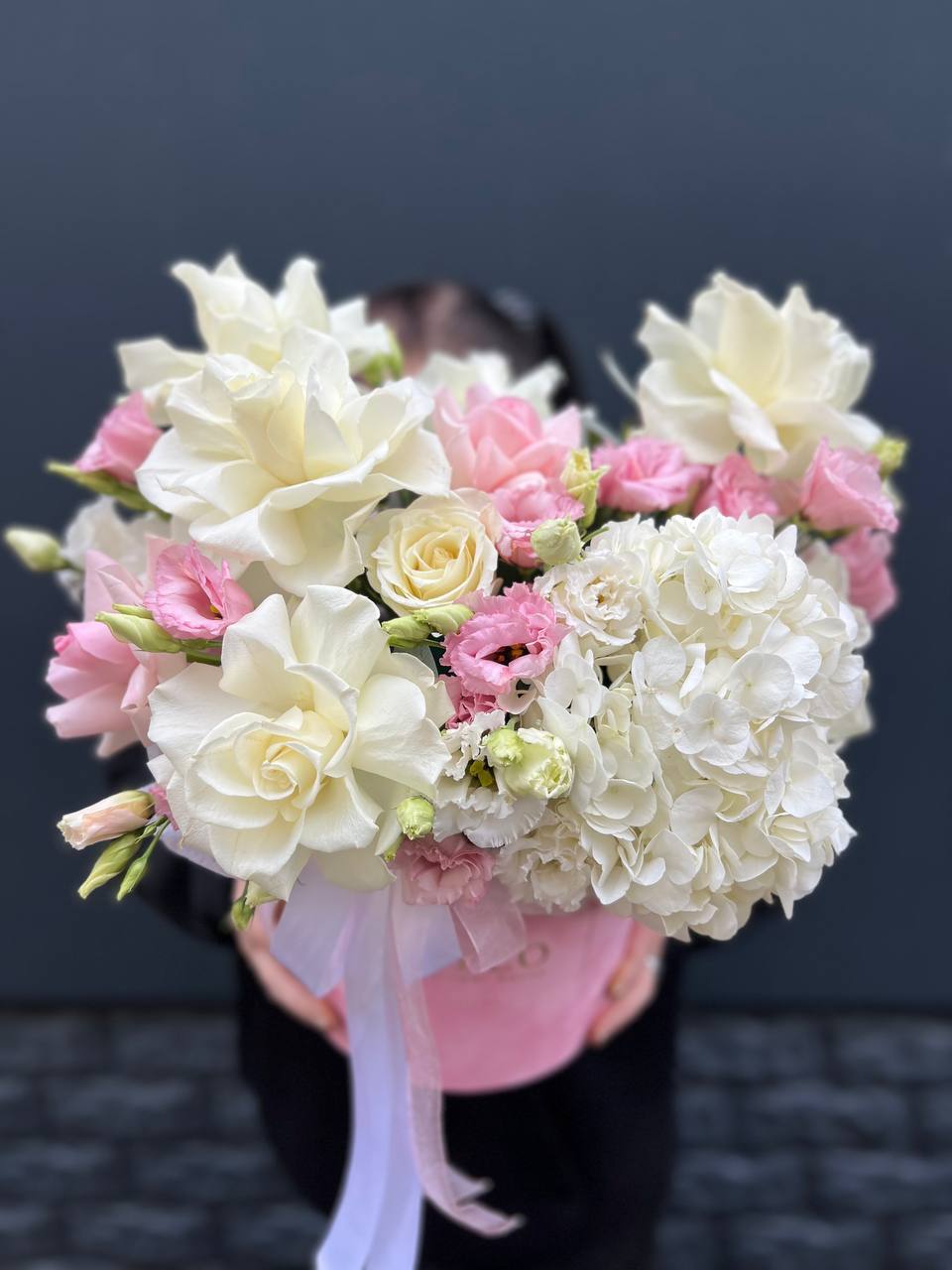 Белоснежная композиция с облачной гортензией и россыпью мелких соцветий создаёт ощущение морозного утра. Хлопок добавляет объём и мягкость силуэту.