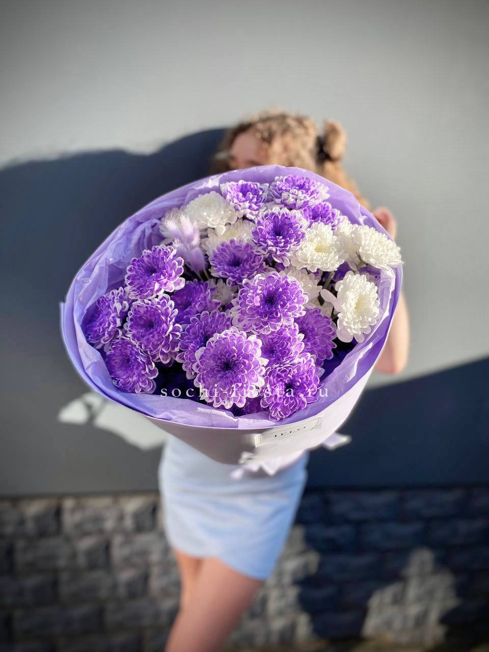 Пять веток кустовой хризантемы собраны в компактную форму с чёткими линиями. Лаконичная упаковка и лента сохраняют естественный объём соцветий. Букет выглядит собранно и свежо.