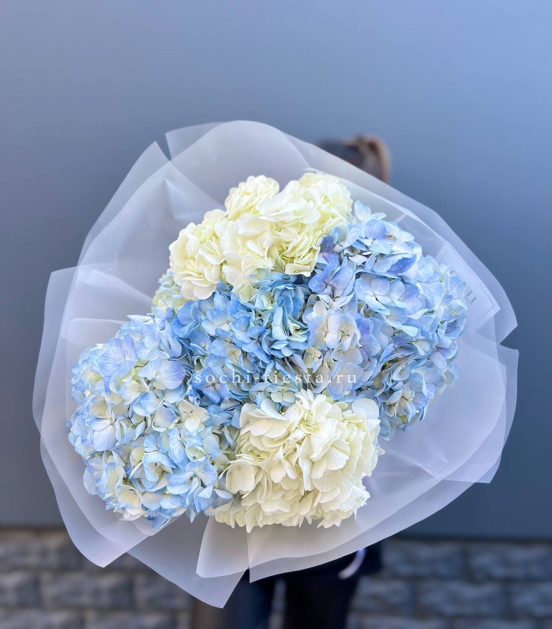гортензия розовая 9шт., лента, дизайнерская упаковка. Цвет гортензий может незначительно отличаться.