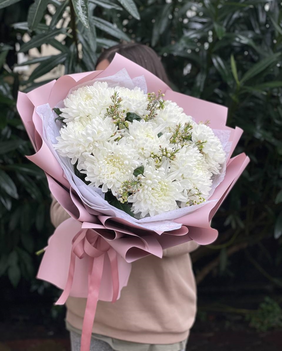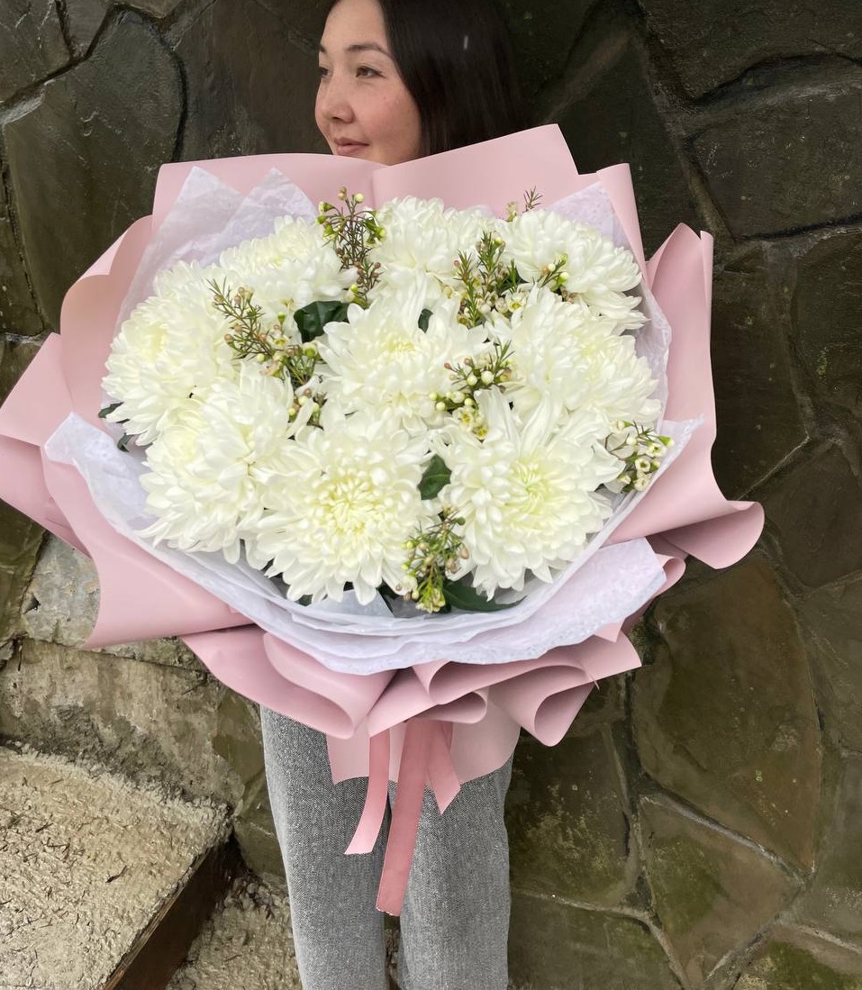 Двадцать пять веток кустовой хризантемы в миксе оттенков образуют живописное полотно. Каждый цвет звучит самостоятельно и при этом перетекает в соседний, создавая динамичную композицию.