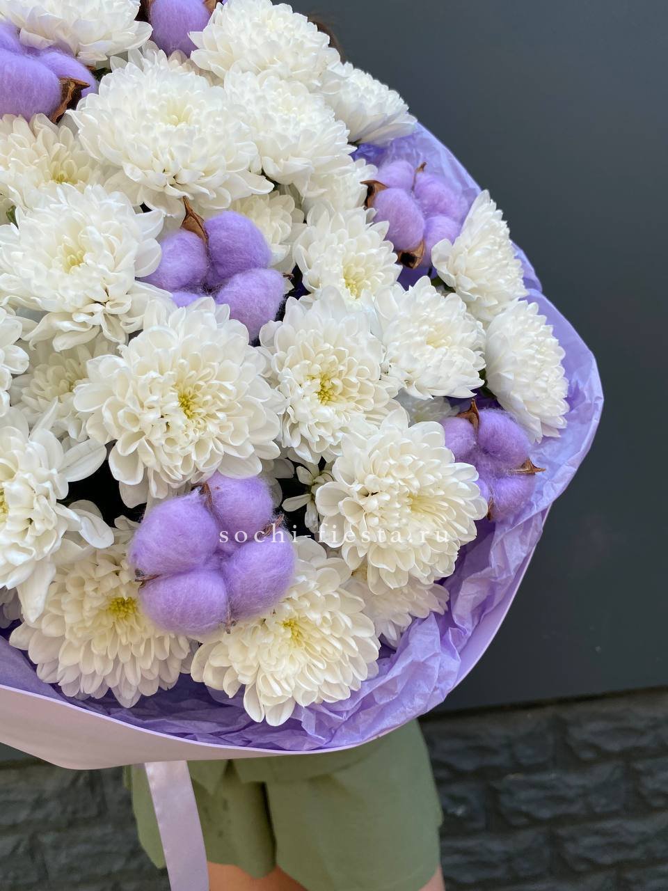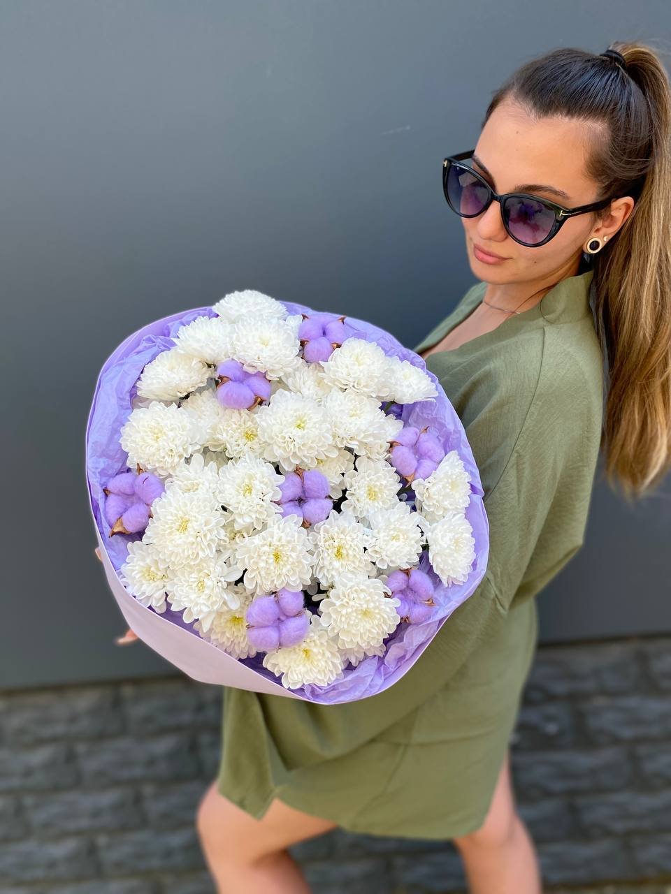 Девять кустовых хризантем собраны в плотный круглый силуэт. Каждая ветка раскрывается веером мелких соцветий, создавая объёмную текстуру. Букет держит форму и выглядит графично.