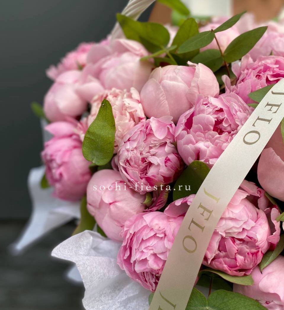 29 пионов, эвкалипт, корзина, лента.