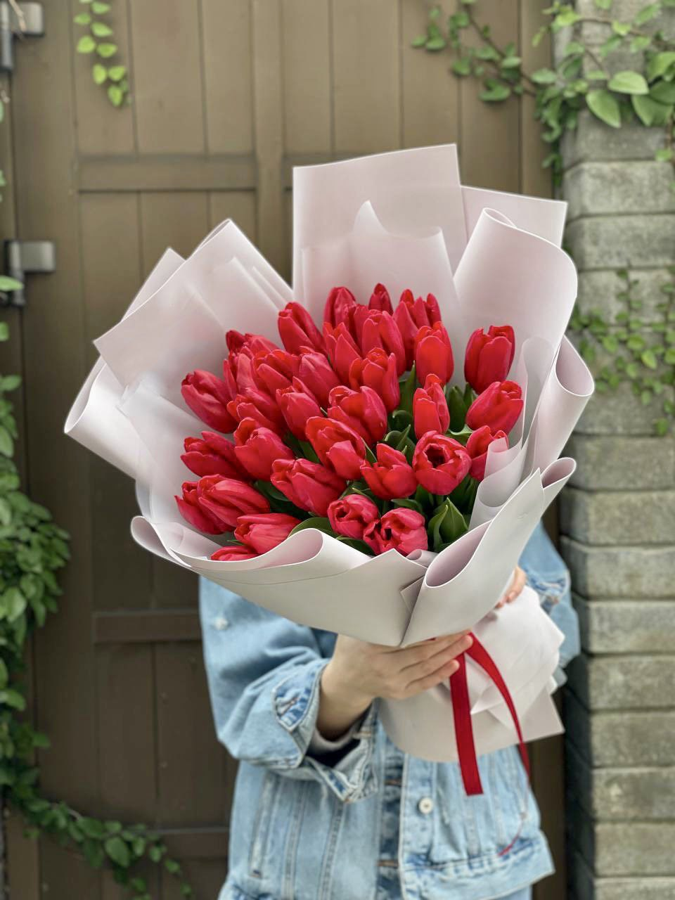 Тридцать пять стеблей выстроены в динамичный вертикальный силуэт. Красный цвет звучит ярко и собранно, а линии букета держат чёткий ритм без лишних деталей.