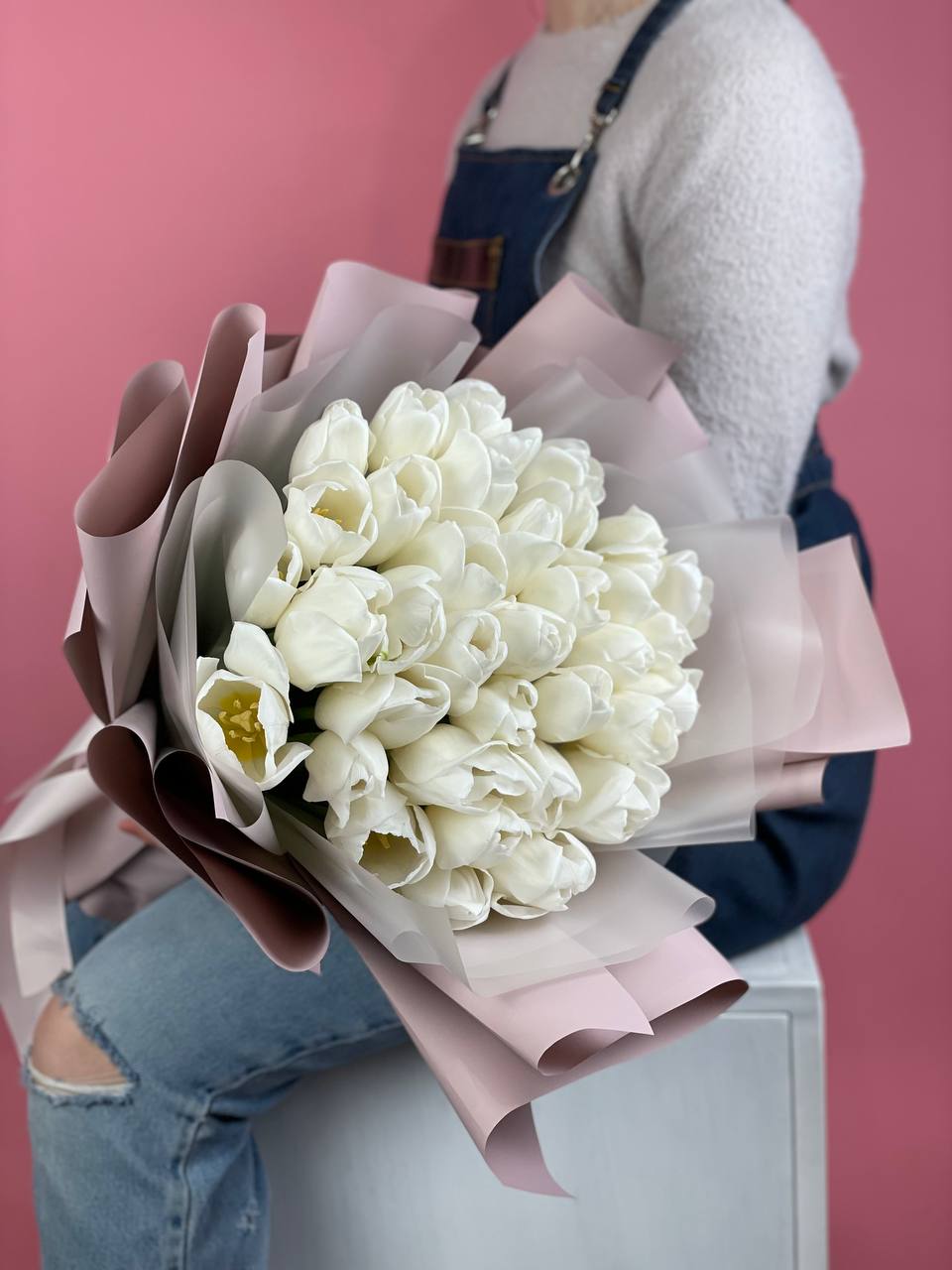 изначальная цена указана за букет из 15 тюльпанов Состав букета на фотографии: 35 тюльпанов, лента, упаковка.