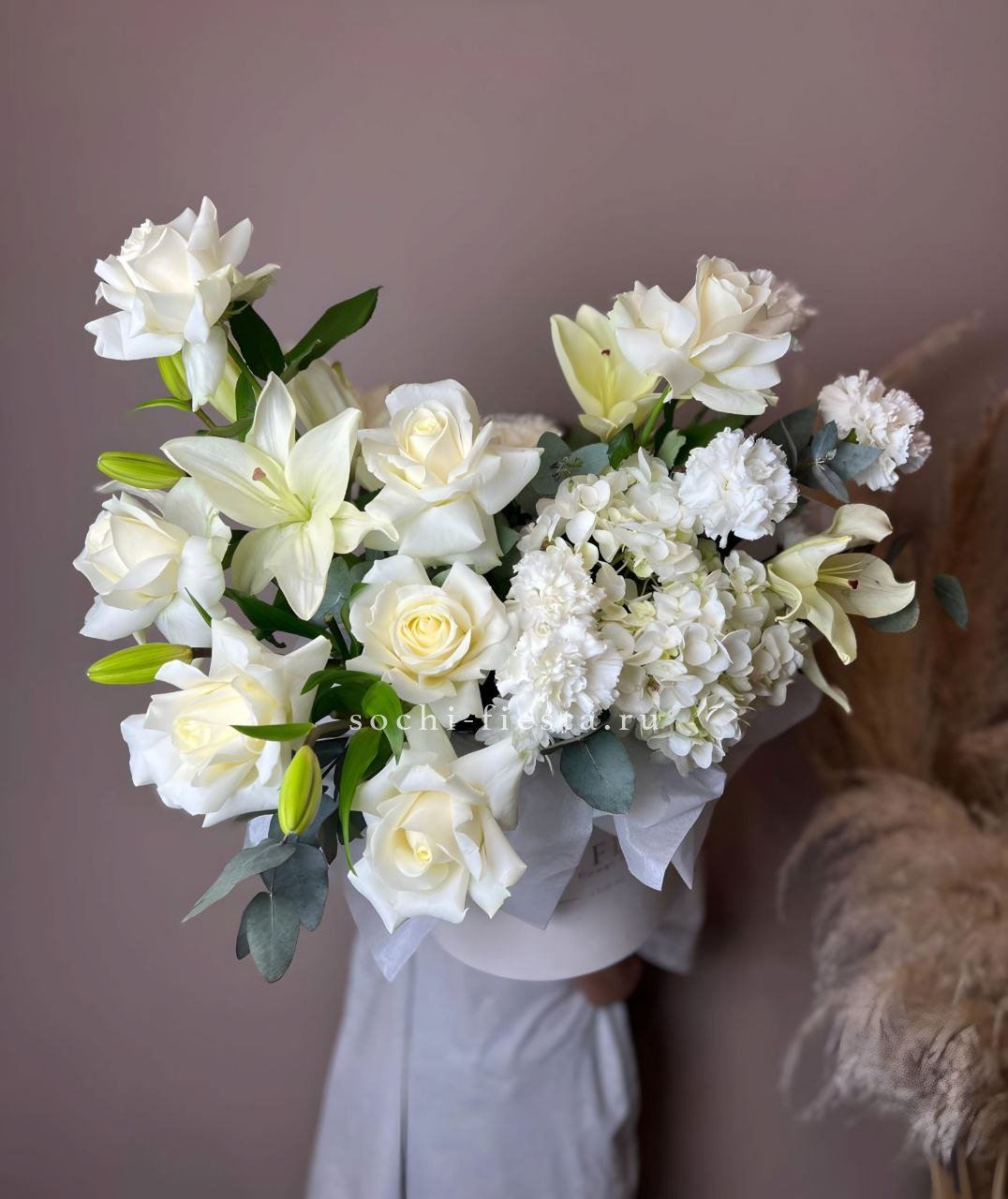 Гортензии и пионы задают основной объем, пионовидные розы добавляют мягкости, а маттиола вносит вертикальные линии. Букет выглядит наполненным и цельным.