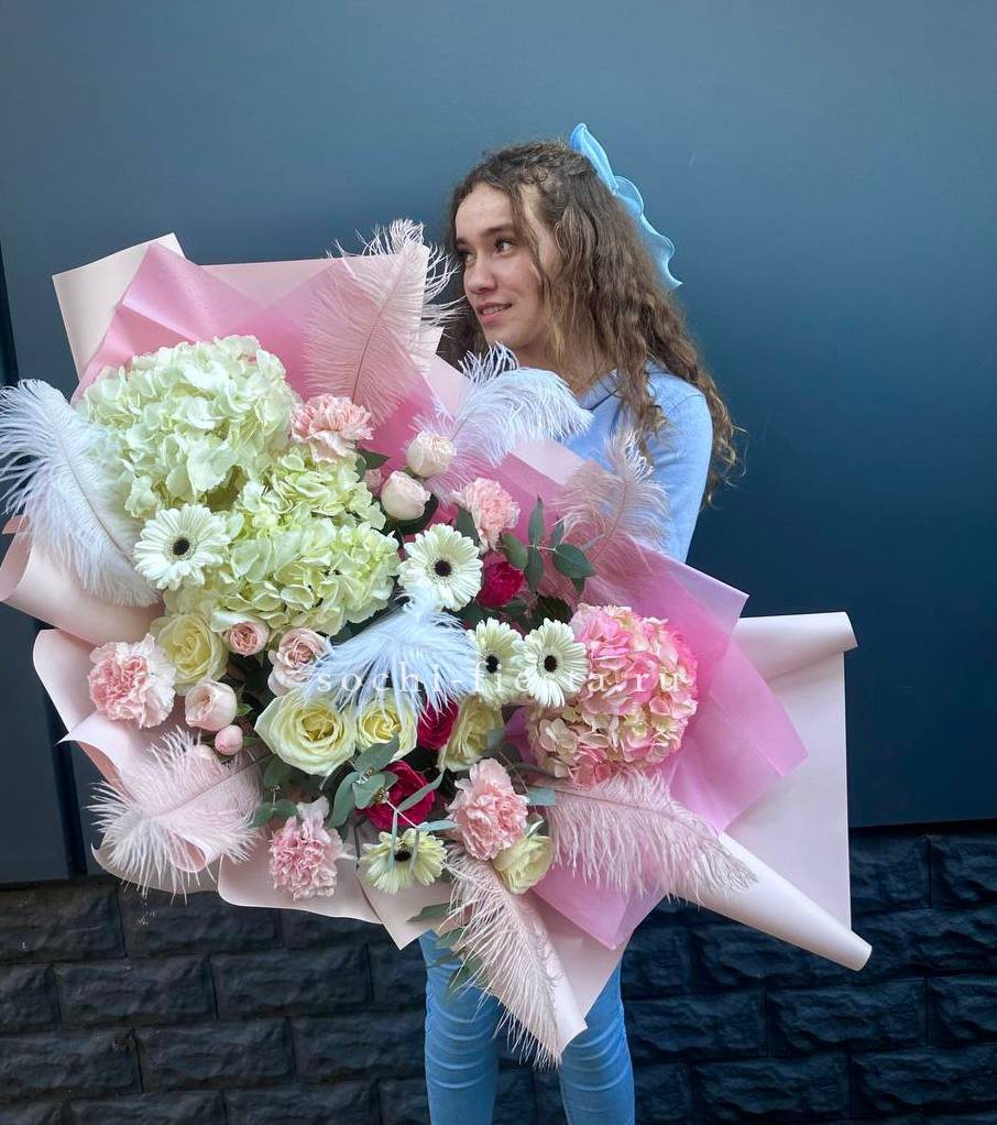 Пышный микс соцветий гортензии, роз и гербер с добавлением перьев и озотамнуса. Авторская композиция объединяет садовую свободу и графичную точность линий.