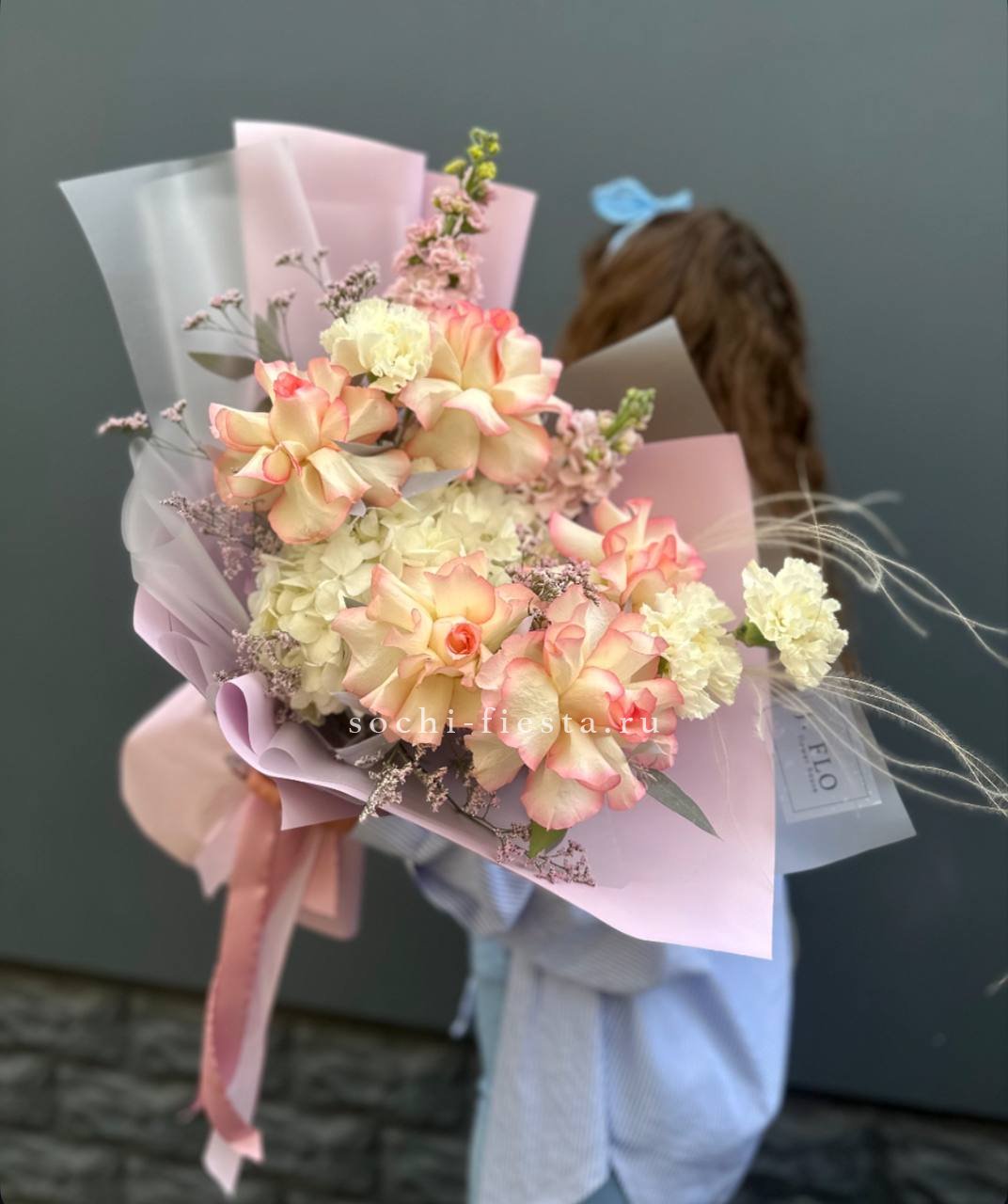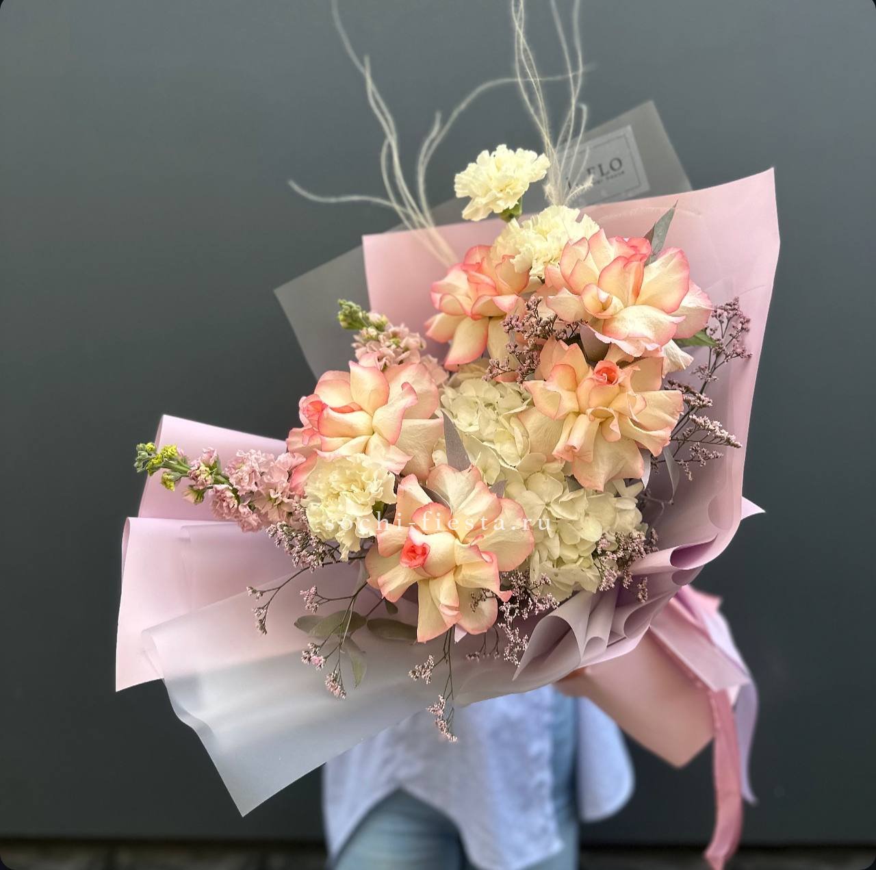 гортензии, роза одноголовая, роза кустовая, гербера, озотамнус, диантус, эвкалипт, декоративные перья, лента, дизайнерская упаковка.