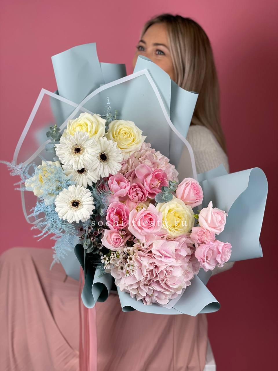 гортензия, белая роза, розовая роза, гербера, эустома, декоративная зелень, эвкалипт дизайнерское оформление, лента.