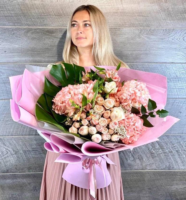 гортензия, розы, пионовидные кустовые розы, эутстома, листья монстеры (или стрелиции), озотамнус, декоративная зелень, дизайнерское оформление.