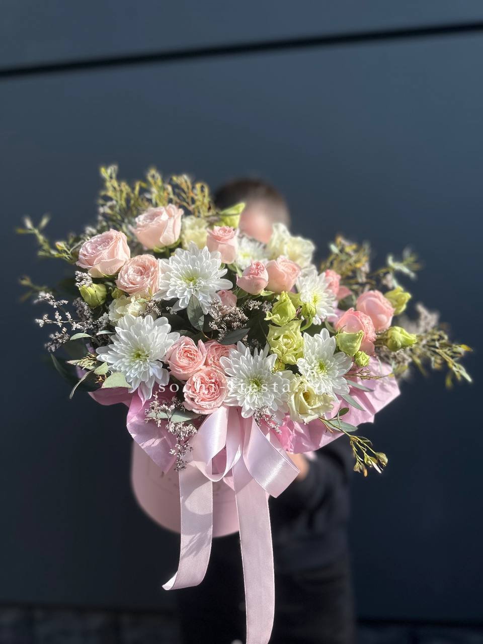 лилии, диантусы, статица, пионы или замена в не сезон эвкалипт, цилиндр.Состав может меняться в зависимости от сезона.