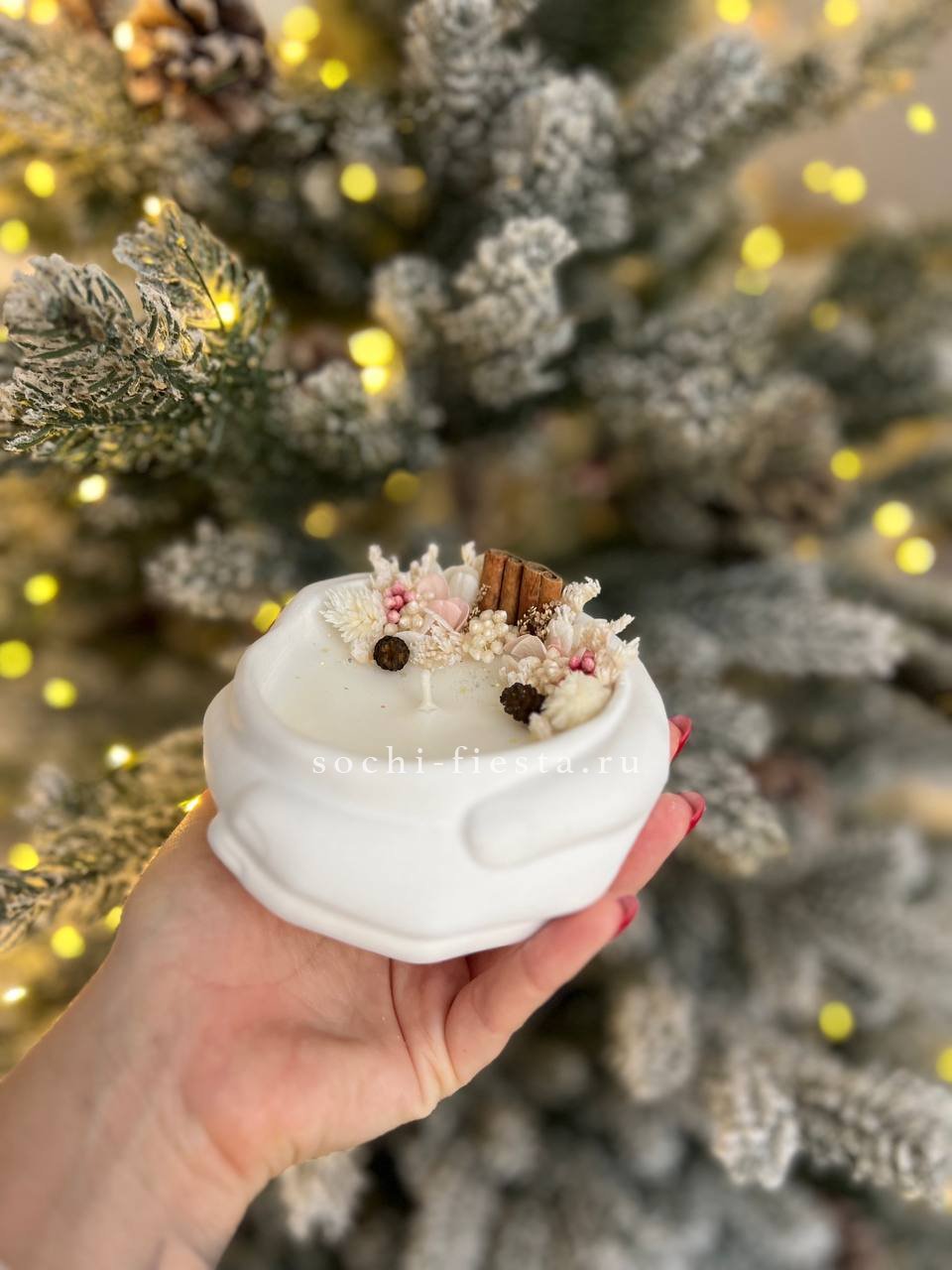 Скульптурная форма из гипса с кокосовым воском и ароматом бузины. Руки бережно держат свечу, создавая камерное пространство для вечернего света и тишины.