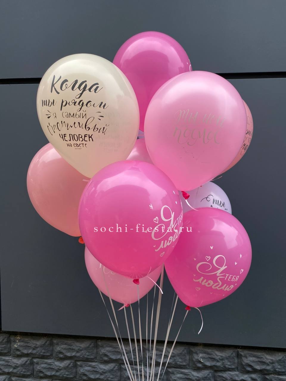 Двенадцать шаров с разными признаниями собраны в лёгкую воздушную группу. Каждая надпись читается отдельно и создаёт личное послание. Простая форма и понятный язык без лишних деталей.