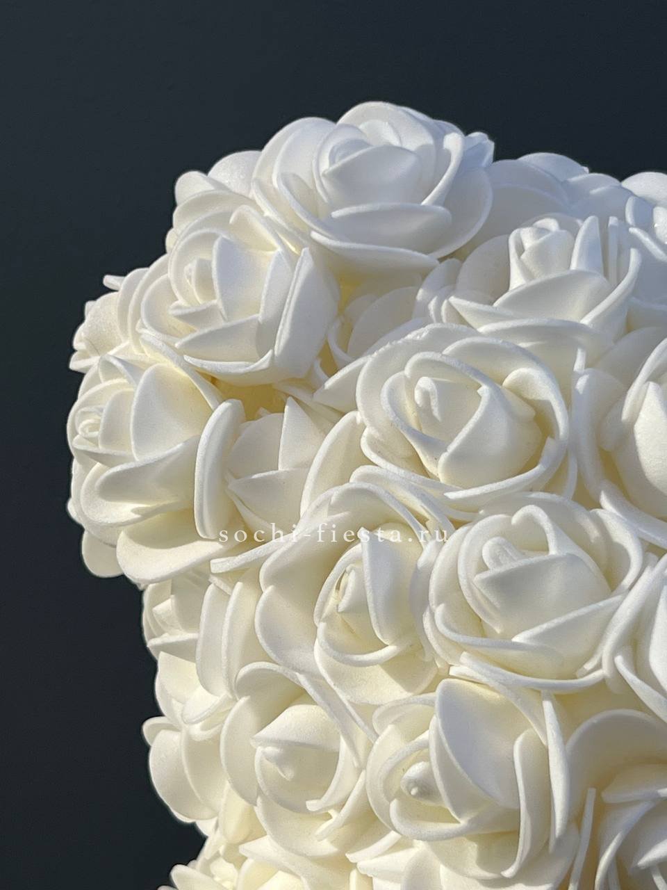 Белый медведь из фоамирана в оттенке шампань напоминает облако из мелких бутонов. Плотная структура материала держит форму и сохраняет первоначальный вид надолго.