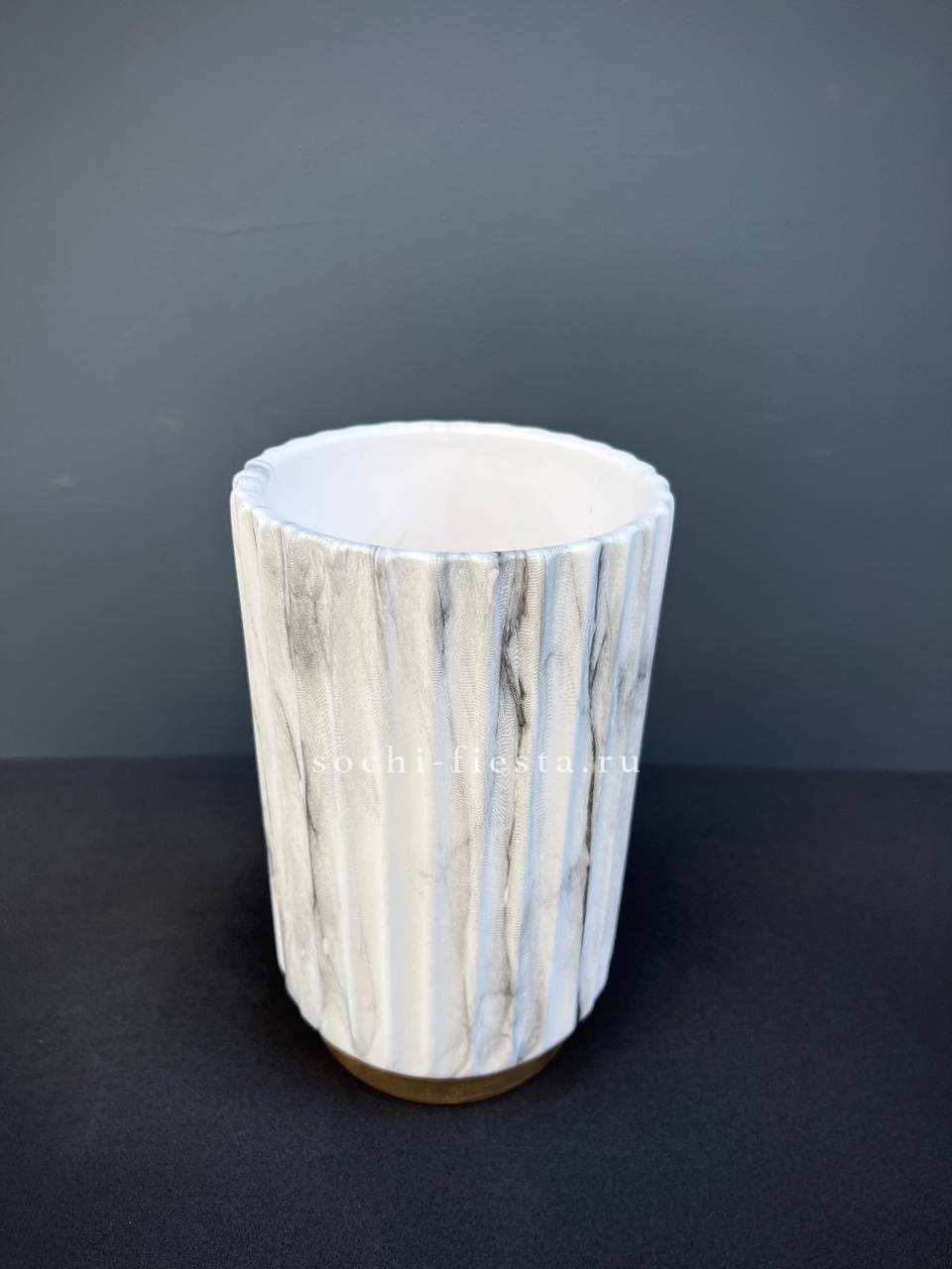 Широкое горлышко позволяет собирать пышные композиции и легко менять воду. Спокойная керамика в серо-белой гамме дополняет пространство без лишних акцентов.