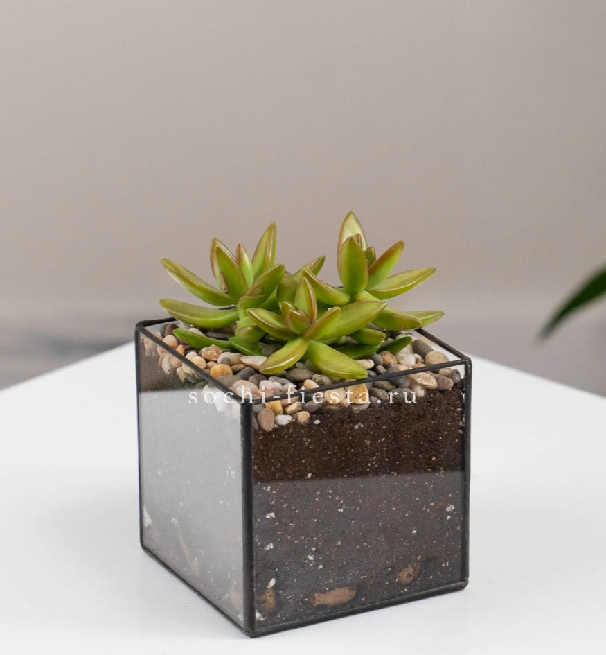 Стеклянный куб с седумом занимает немного места и вписывается в любой интерьер. Суккулент сохраняет свежесть долго и не требует частого полива.