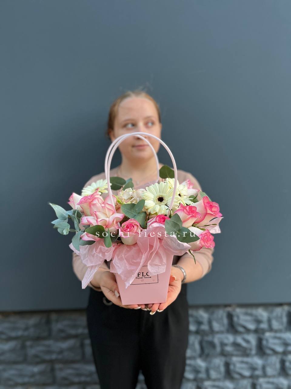 эустома, кустовые розы, белые розы, диантусы, лента, сумка-кашпо.