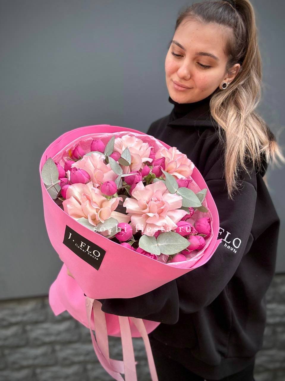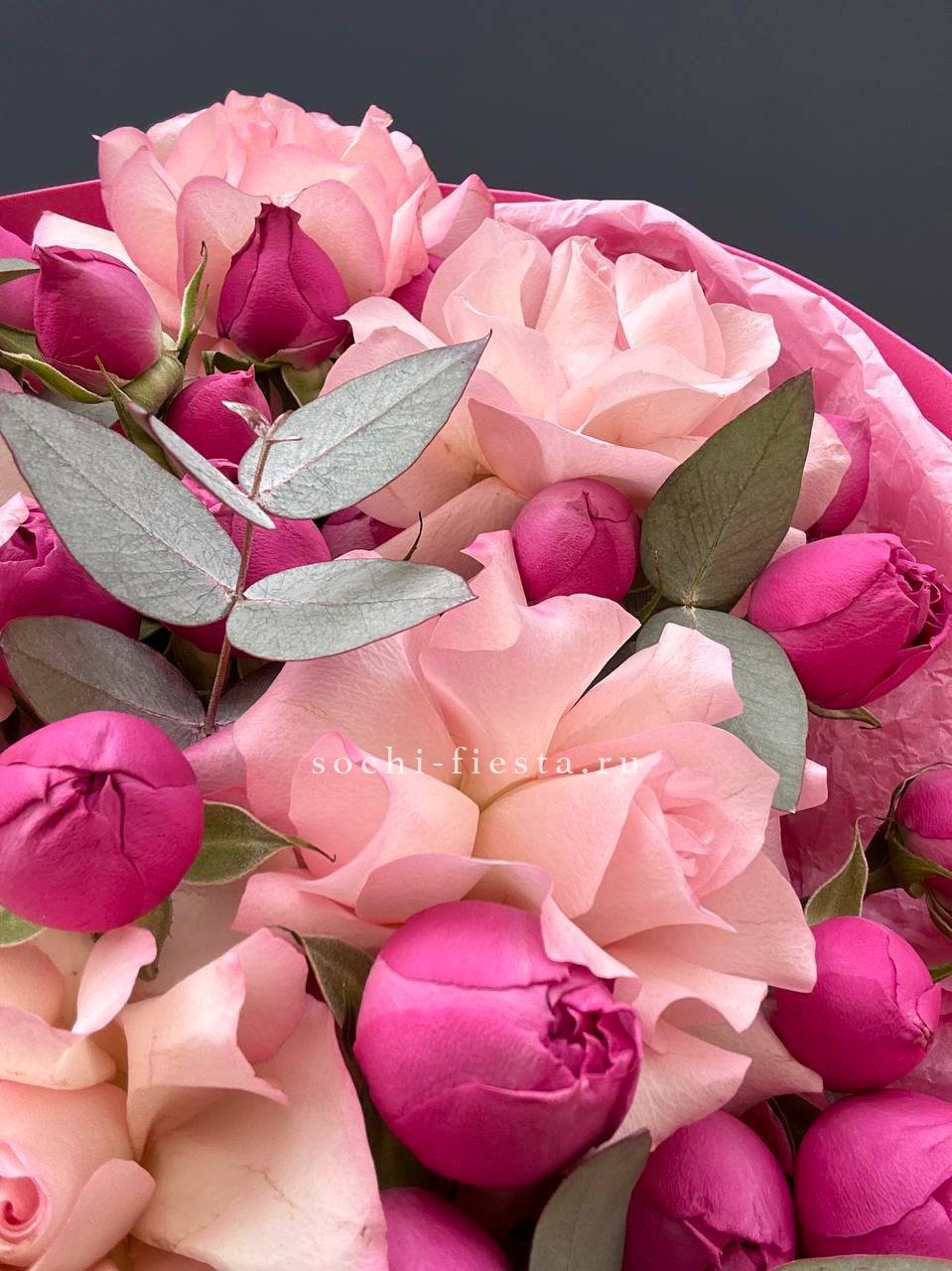 розовая и белая розы, пионовидная роза, кустовые розы, эвкалипт, лента, сумка.