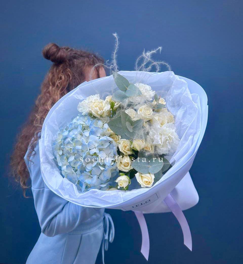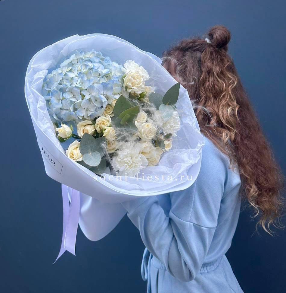 гортензия, гипсофила, лента, дизайнерская упаковка.