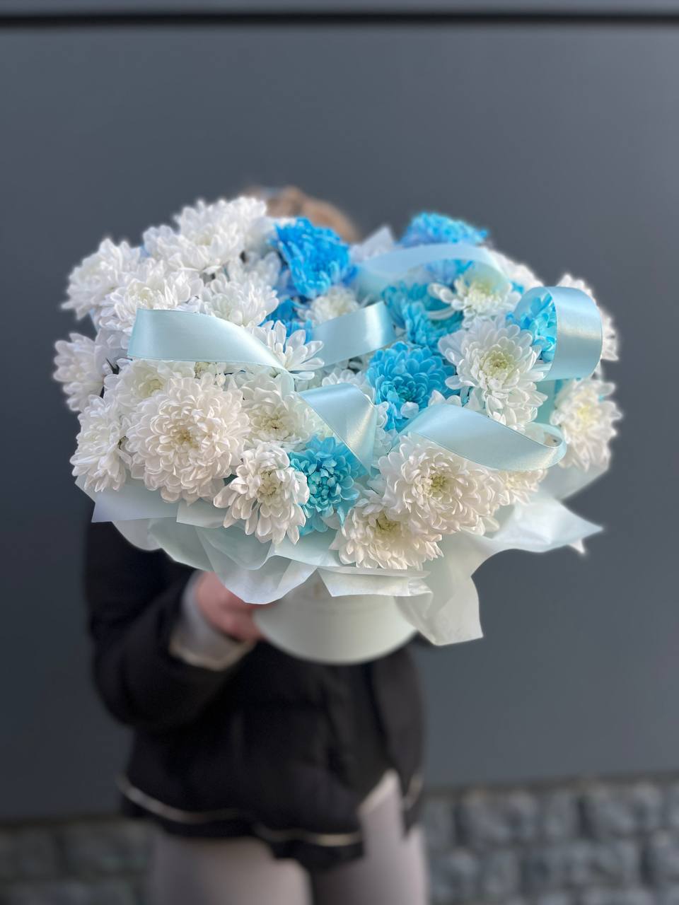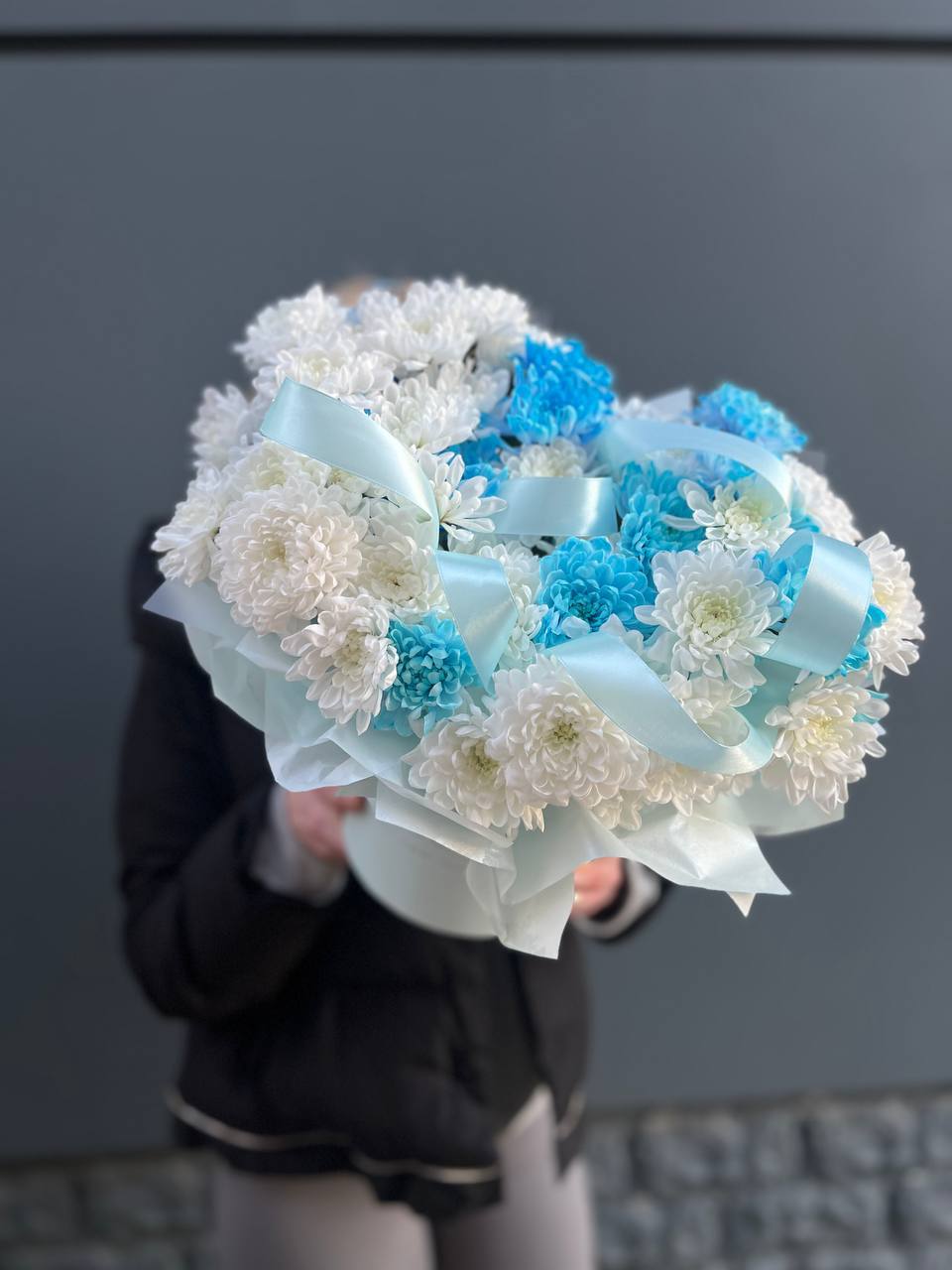 хризантемы в боксе с лентами.
