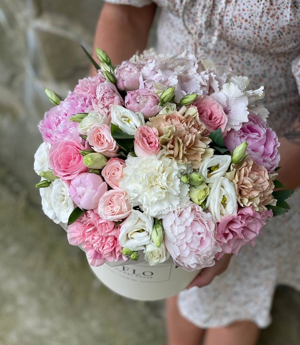 эустома, гортензия, белая роза, диантус, статица, бомбастик, бокс.