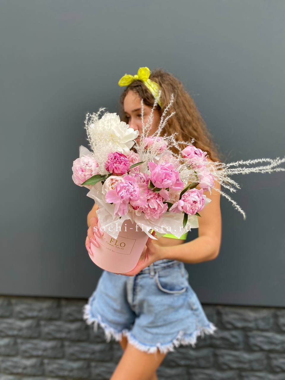 Пятнадцать пионов поднимаются над пушистыми метелками пампасной травы. Округлые бутоны контрастируют с воздушной текстурой злака. Композиция выглядит объемно при компактном основании.