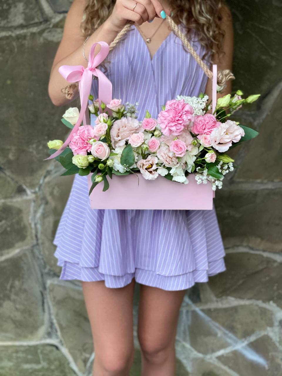 Пятнадцать пионов наполняют деревянный ящик плотной волной бутонов разной степени раскрытия. Композиция держит форму и притягивает взгляд многослойной фактурой лепестков.