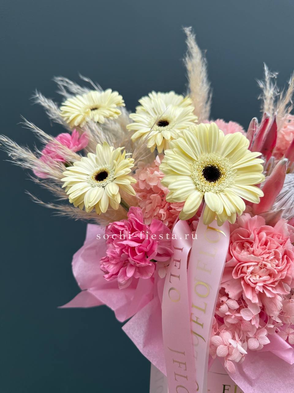 протея, гортензия, герберы, диантусы, картадерия цилиндр D16.