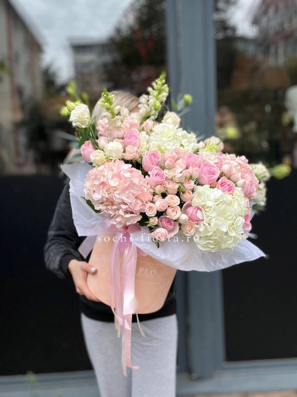 гортензии, эустома, розы, бомбастик, эвкалипт, антиринум в боксе 25.