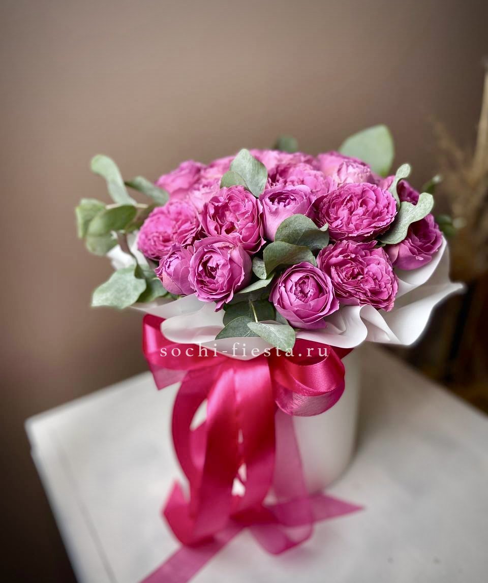 Цилиндр собран из пионов, роз и эустомы с добавлением диантусов и альстромерии. Амарант и эвкалипт создают объёмную текстуру. Композиция выразительна и хорошо держит форму.