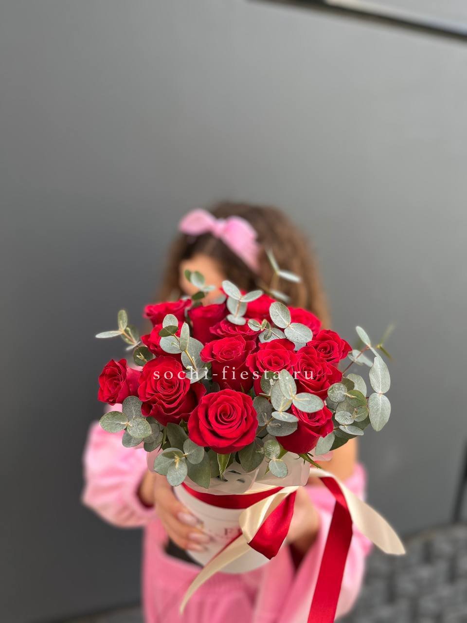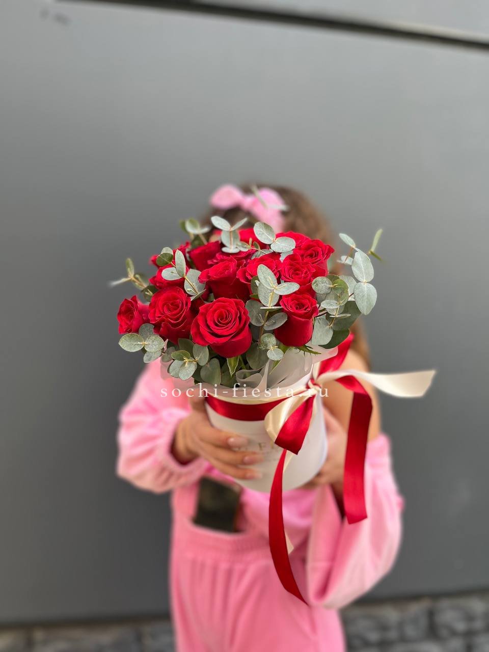 красные розы, эвкалипт, цилиндр D16, лента.