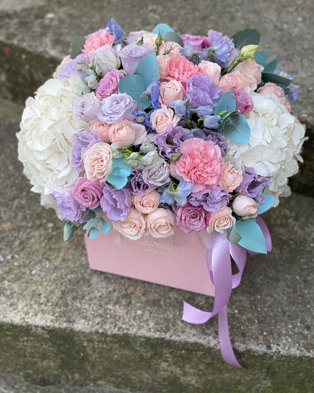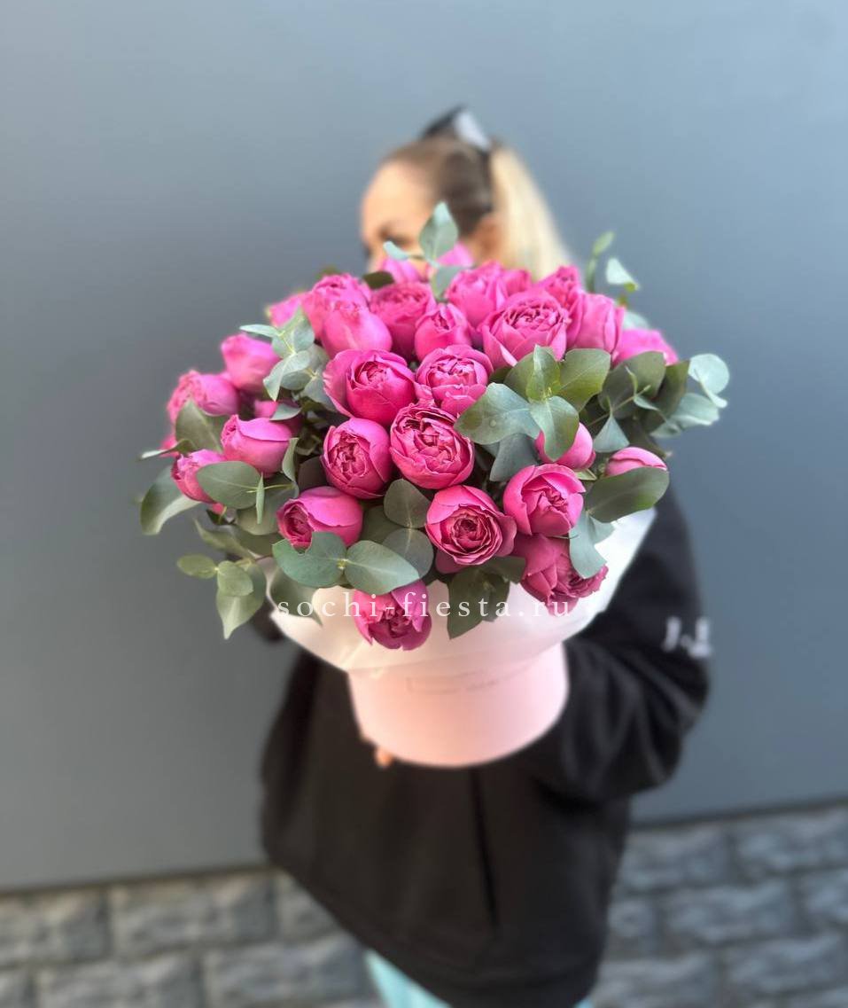 Пионовидные кустовые розы формируют плотный купол с мягкими переходами оттенков. Каждый бутон раскрывается слоями, создавая объёмную текстуру. Эвкалипт добавляет свежести композиции в цилиндре.