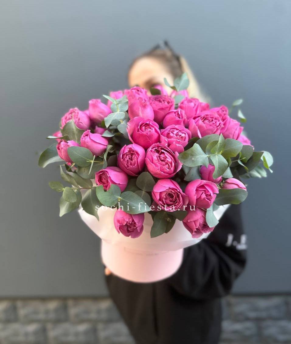 пионовидные кустовые розы 25 шт., эвкалипт, зелень, лента, цилиндр D20.