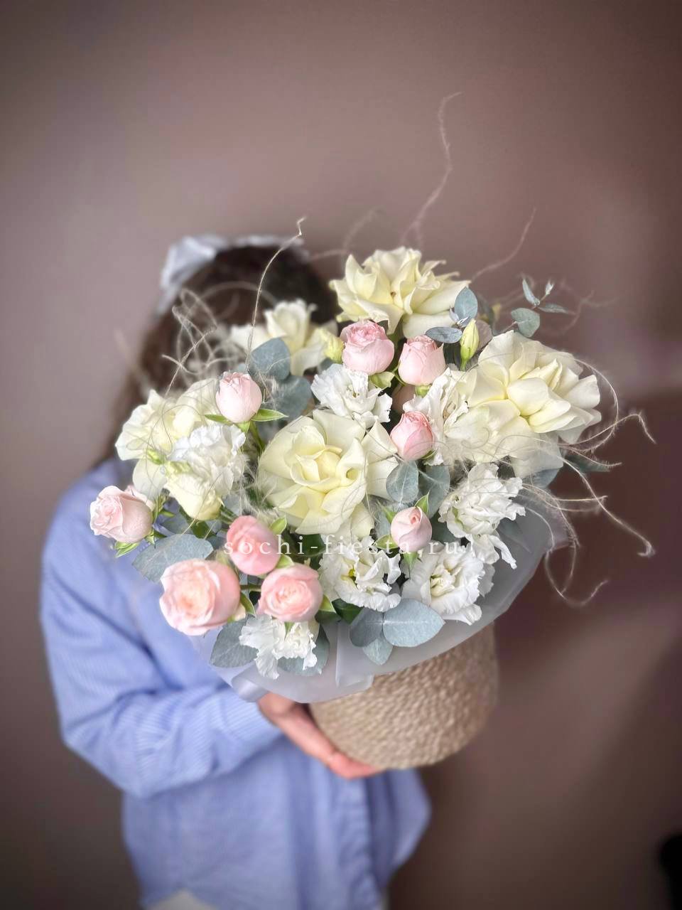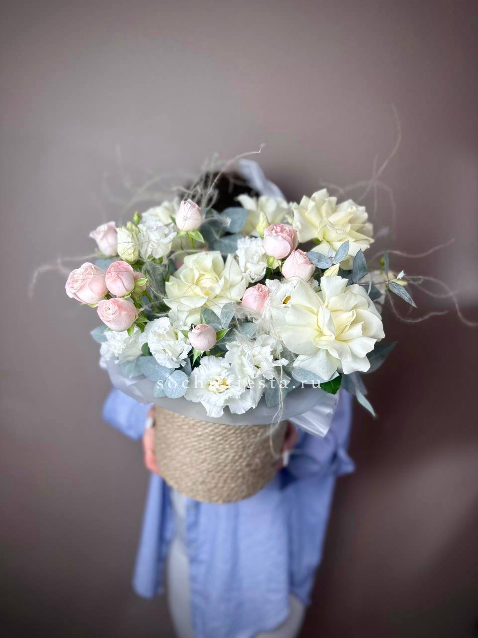 белые розы, герберы, диантусы, эустома, эвкалипт, джутовое кашпо.