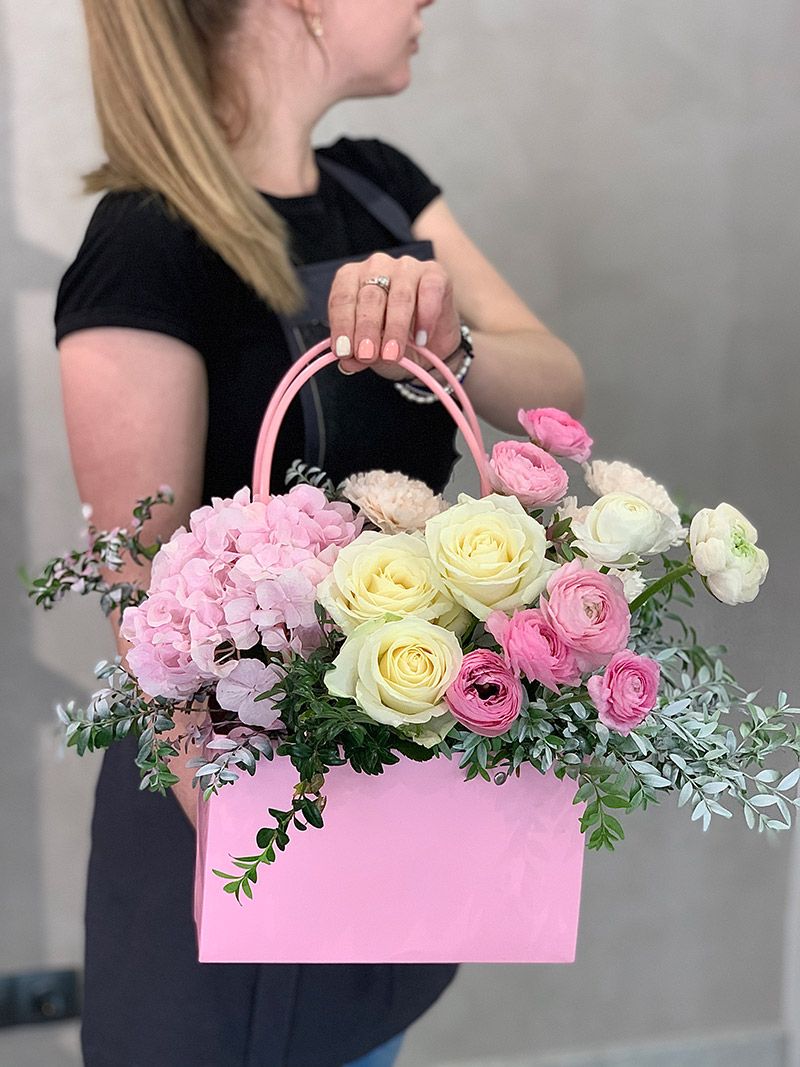 гортензия розовая, диантус, роза одноголовая, ранункулюс или пионовидная кустовая роза, лента, сумка-кашпо.