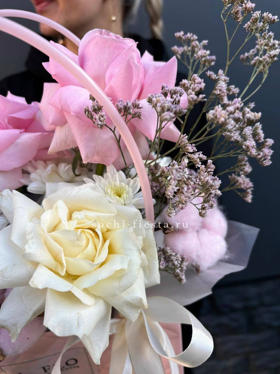 Воздушная композиция из диантусов и альстромерии в удобном формате. Цветы на оазисе держат свежесть долго и не требуют сложного ухода.