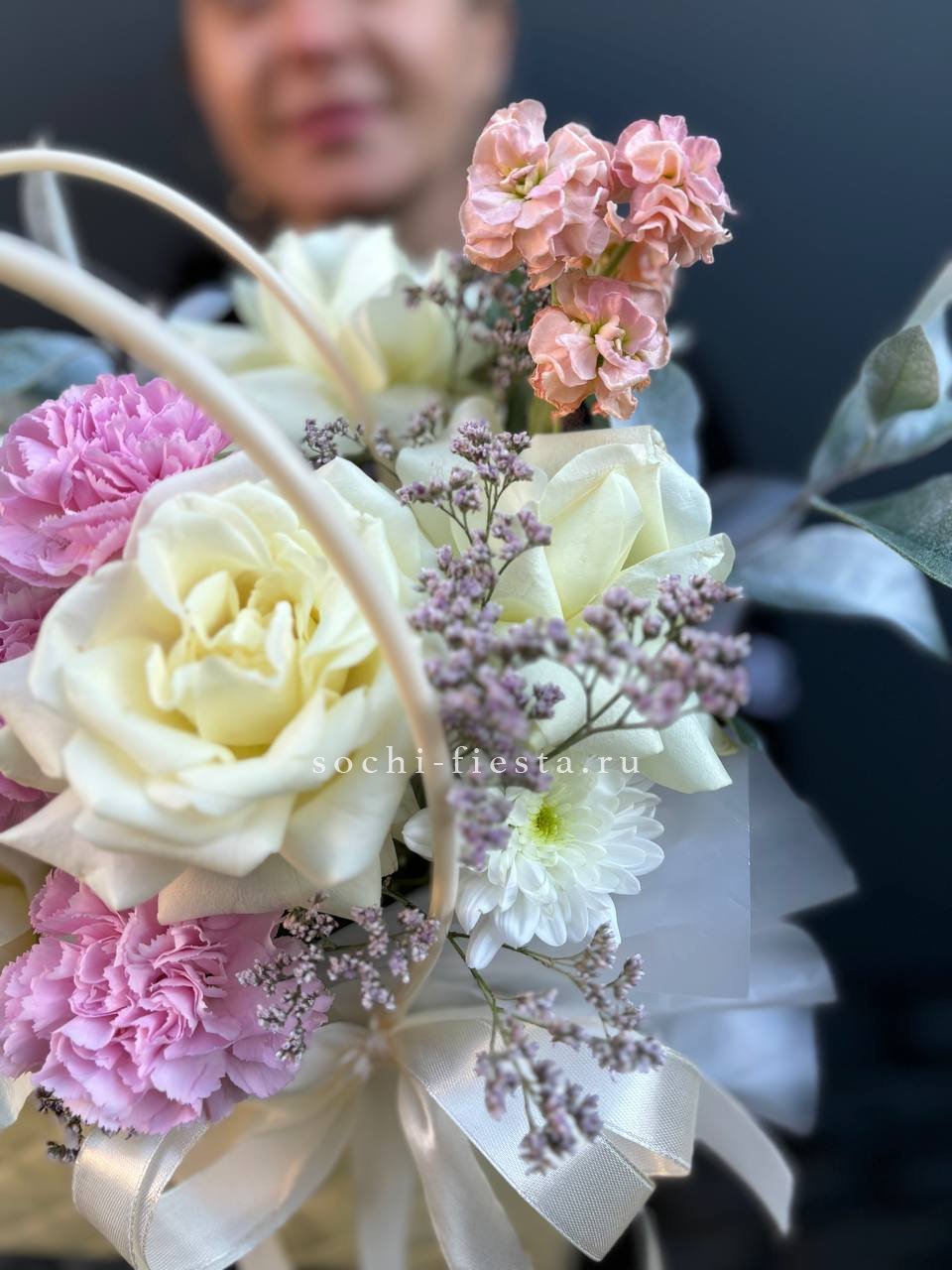 Белоснежные розы переплетаются с воздушной эустомой и раскрытыми лилиями в аккуратной цветочной сумке. Эвкалипт создаёт прохладный фон для светлых бутонов. Композиция на оазисе сохраняет свежесть и форму долгое время.