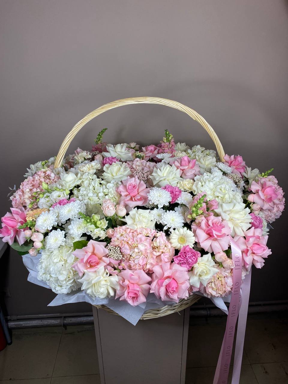Восемь видов цветов складываются в harmonичную композицию со светлой корзиной в основе. Диантусы и эустома перекликаются с розами, а гортензия задает мягкий объем всей структуре.