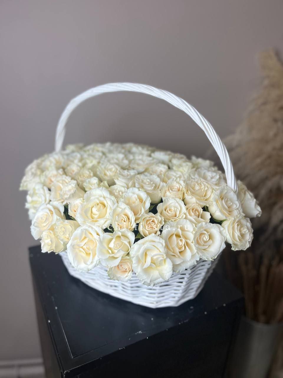 Пышная корзина с розами и гортензиями собрана плотно и объёмно. Маттиола добавляет живую текстуру между крупными соцветиями, а кустовые розы заполняют композицию мягкими переходами. Результат — впечатляющее присутствие, которое меняет восприятие пространства.