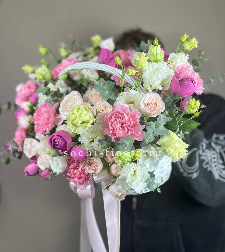 маттиола, гортензии, кустовые розы, розовые розы в корзине.