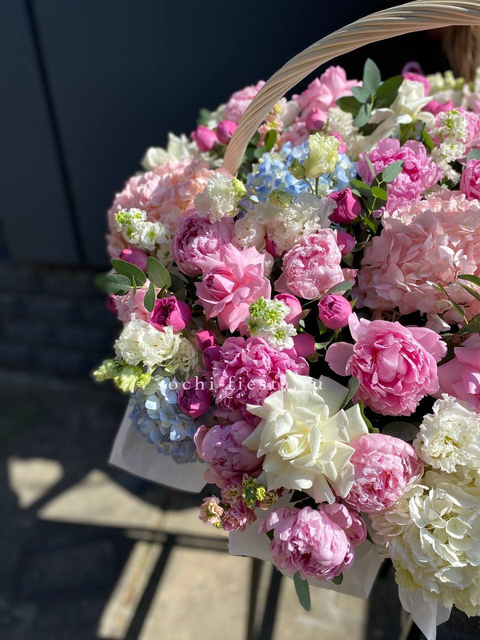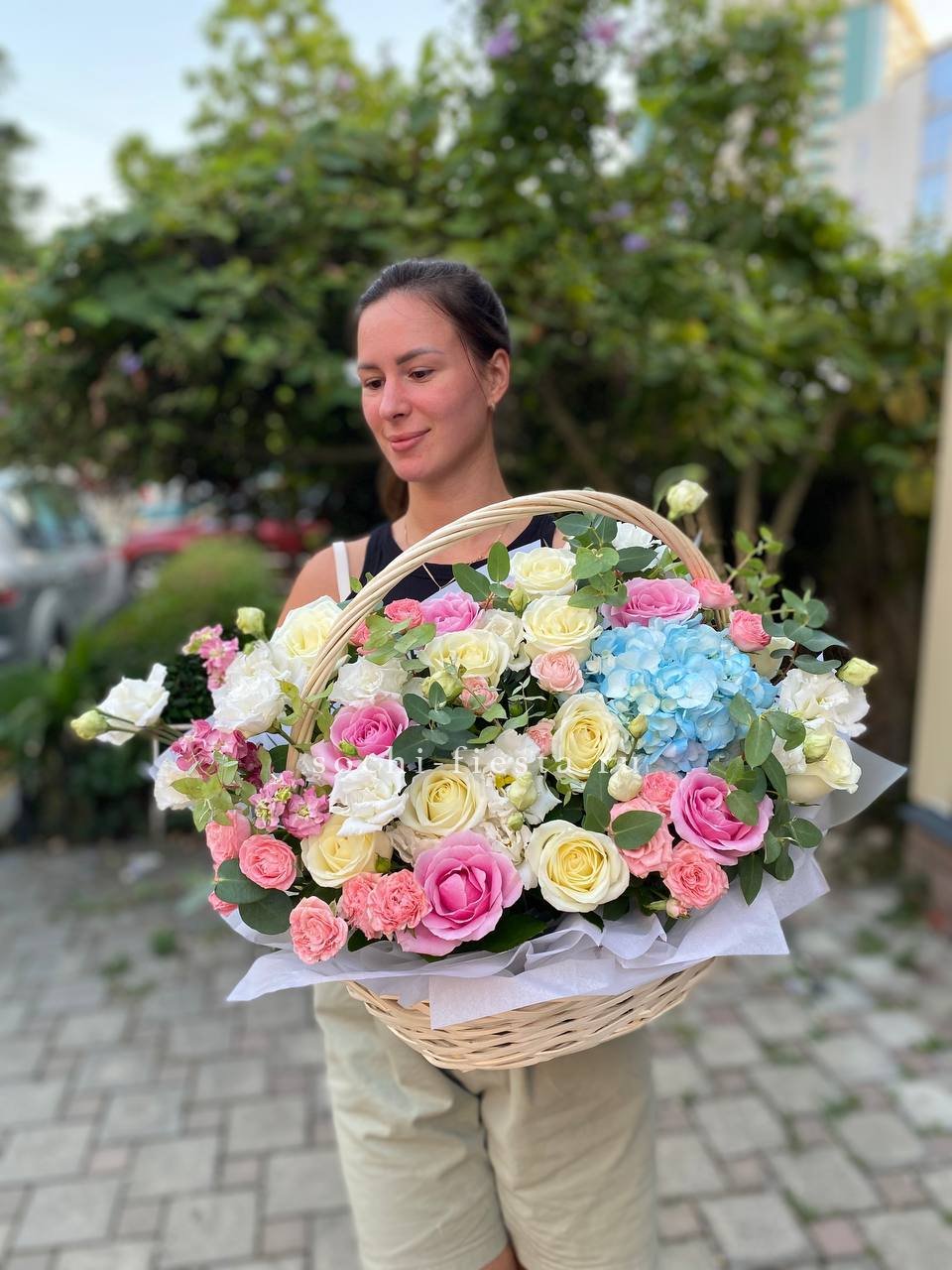 Воздушные соцветия эустомы собраны в округлую композицию с мягким переходом пастельных тонов. Светлая корзина создает легкую базу для объемной цветочной шапки.