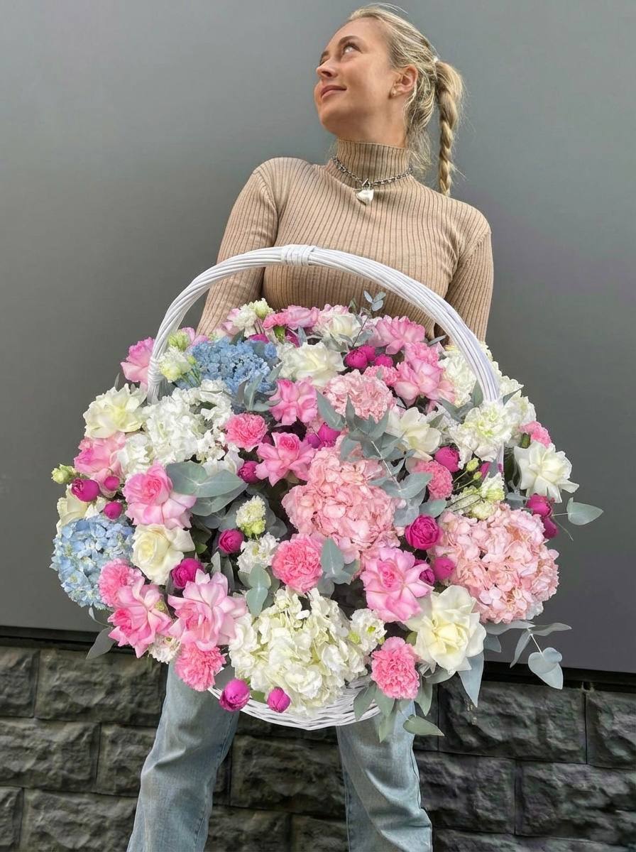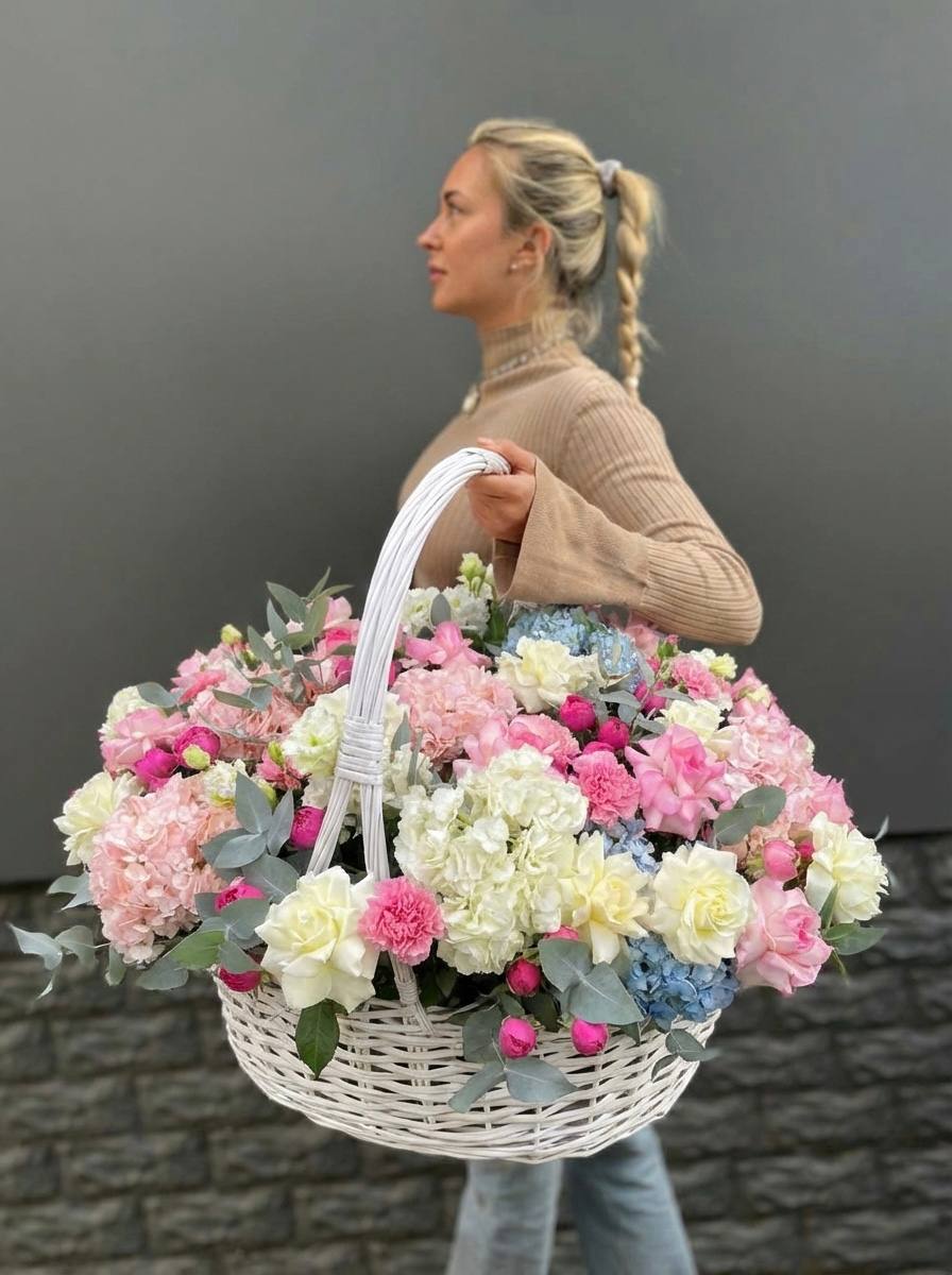 Сорок одна пионовидная роза в светлой корзине выстраивает объёмную композицию с мягкими переливами лилового и розового. Эвкалипт обрамляет густую россыпь бутонов.