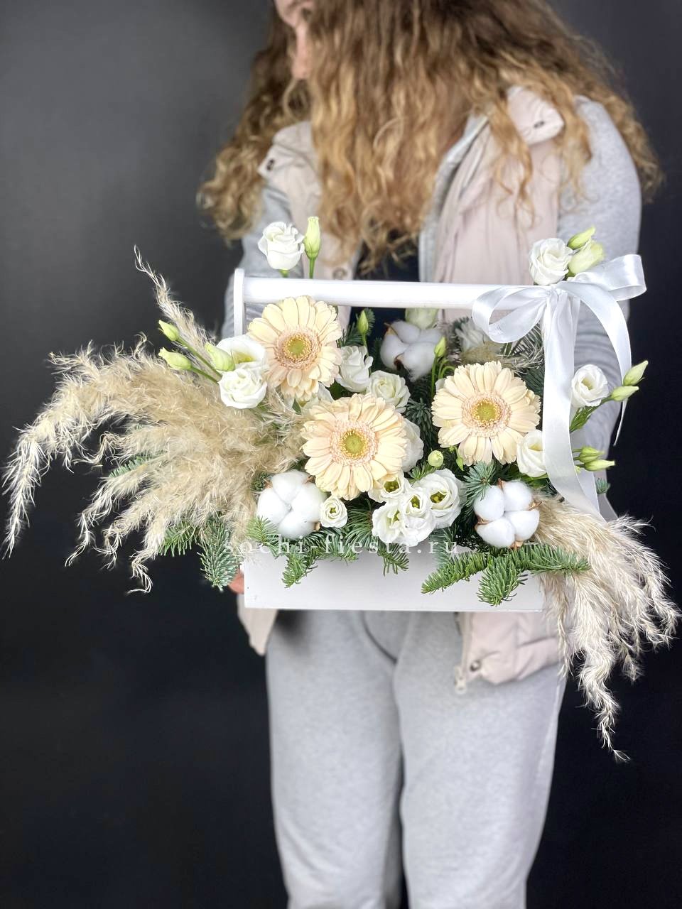 Герберы и эустома раскрываются среди хвойной зелени, образуя мягкий цветовой переход. Хлопок и сухоцветы добавляют композиции природной фактуры, а датский нобилис держит форму в любом пространстве.