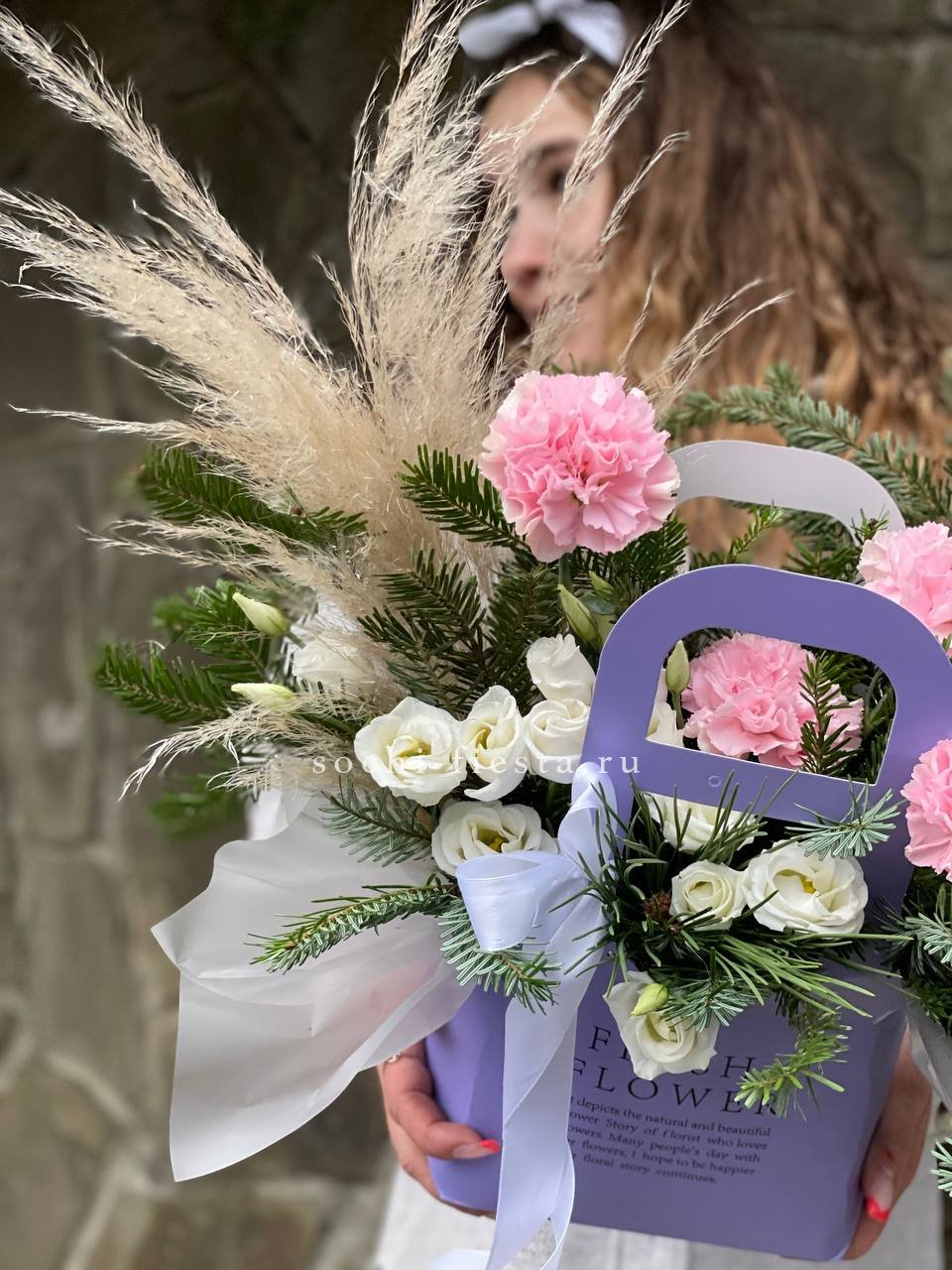 Диантусы и эустомы соседствуют с веточками нобилиса в компактной сумочке. Пампасная трава вносит мягкую текстуру, а лента фиксирует форму и добавляет завершённость композиции.