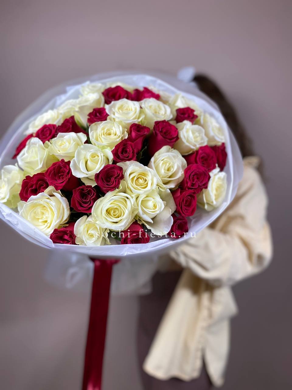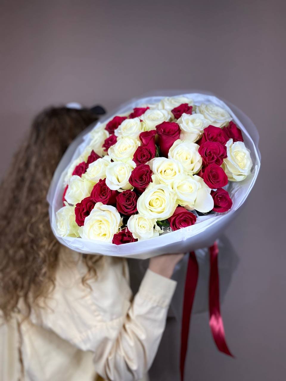 55 роз белого и розового оттенков или же с добавлением кремовой розы, лента, упаковка.