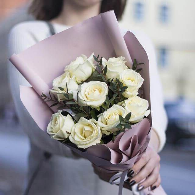 9 белых роз, декоративная зелень, дизайнерская упаковка.