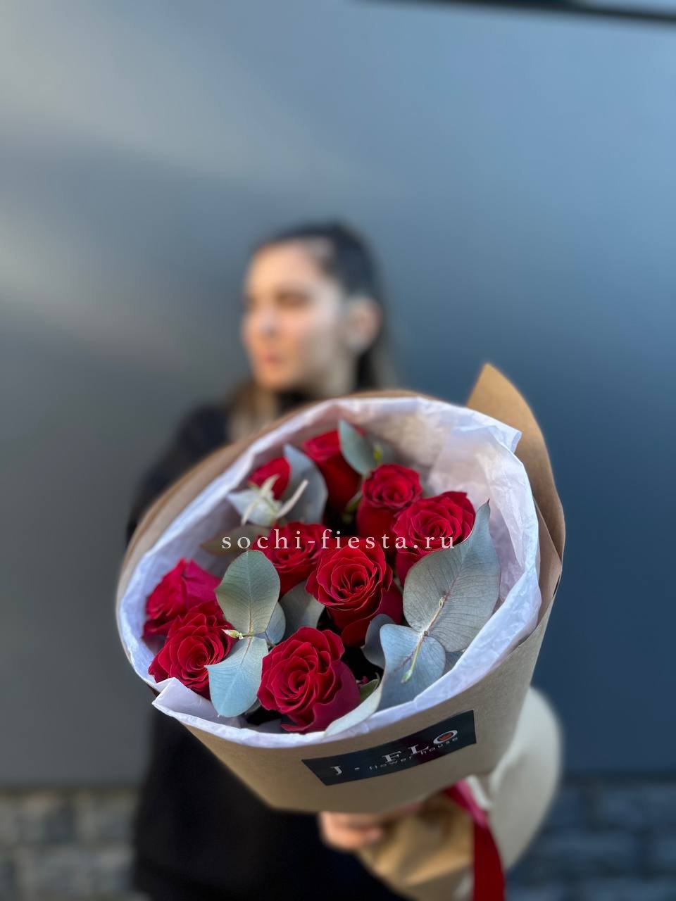 Пятнадцать красных роз в лаконичной упаковке держат безупречную вертикаль и собраны так плотно, что линия букета остаётся чёткой и графичной. Форма читается с любого угла и не теряет выразительности даже в высоких вазах.