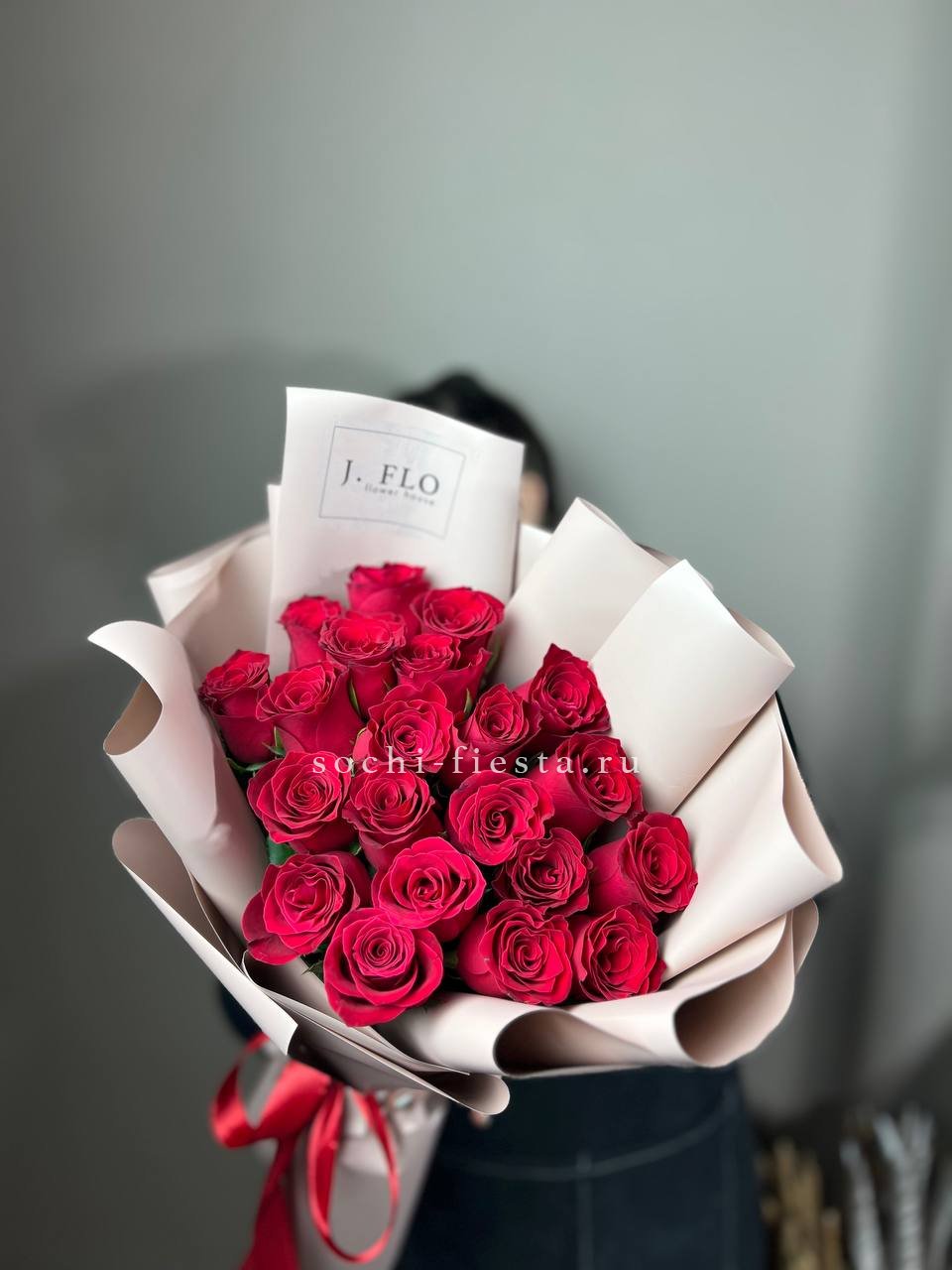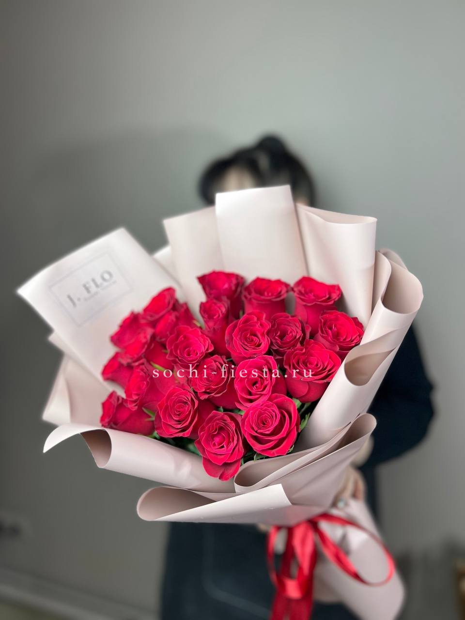 Двадцать пять красных роз в дизайнерской упаковке выглядят уверенно и сдержанно. Плотный силуэт букета подходит для выражения чувств без лишних слов.